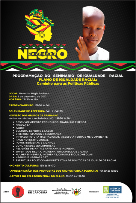 Será realizado no próximo sábado, 9, o Seminário de Igualdade Racial, ainda como parte da programação do Novembro Negro. O evento acontece na Casa Memorial Régis Pacheco, das 13h30 às 19h, trazendo à discussão seguinte tema: “Plano de Igualdade Racial: Caminho para as políticas públicas”.