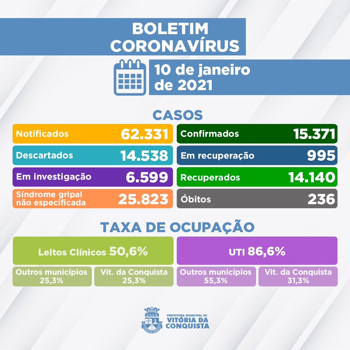 De acordo com o Boletim epidemiológico atualizado deste domingo (10), já foram contabilizados 15.371 casos confirmados da Covid-19 em Vitória da Conquista. Desse total, 14.140 pessoas já estão recuperadas e 236 faleceram por complicações da doença.