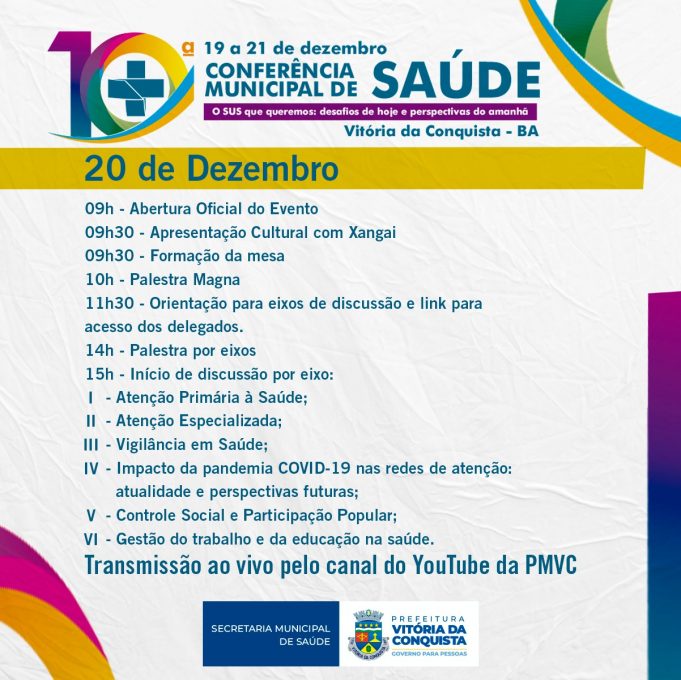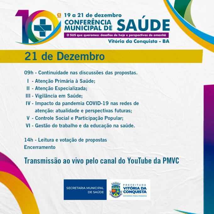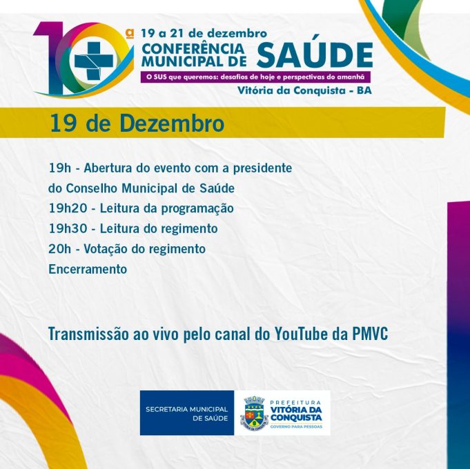Começa no domingo (19) e vai até a próxima terça-feira (21), a Conferência Municipal de Saúde, que será realizada de forma 100% on-line, por transmissão ao vivo no Youtube pelo canal oficial da Prefeitura. O Conselho Municipal de Saúde (CMS) convoca a população de Vitória da Conquista para participar.