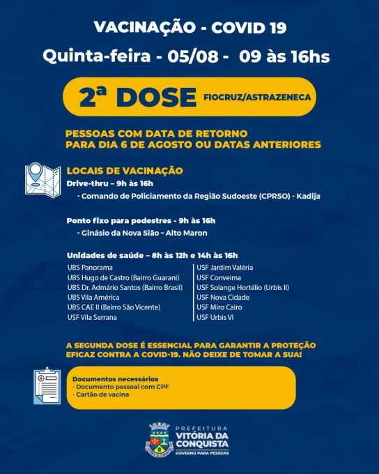 SEGUNDA DOSE – Nesta quinta-feira (5), a aplicação da 2ª dose estará disponível para pessoas que tiverem a data de retorno da 2ª dose da AstraZeneca/Fiocruz agendada para o dia 6 de agosto ou datas anteriores.