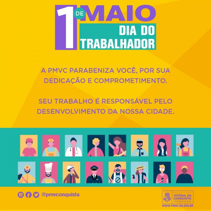 Neste Dia do Trabalhador, a Prefeitura de Vitória da Conquista agradece a cada um que trabalha por nossa cidade. Com cada um de vocês, vamos passar pela pandemia e continuar construindo uma cidade ainda melhor.