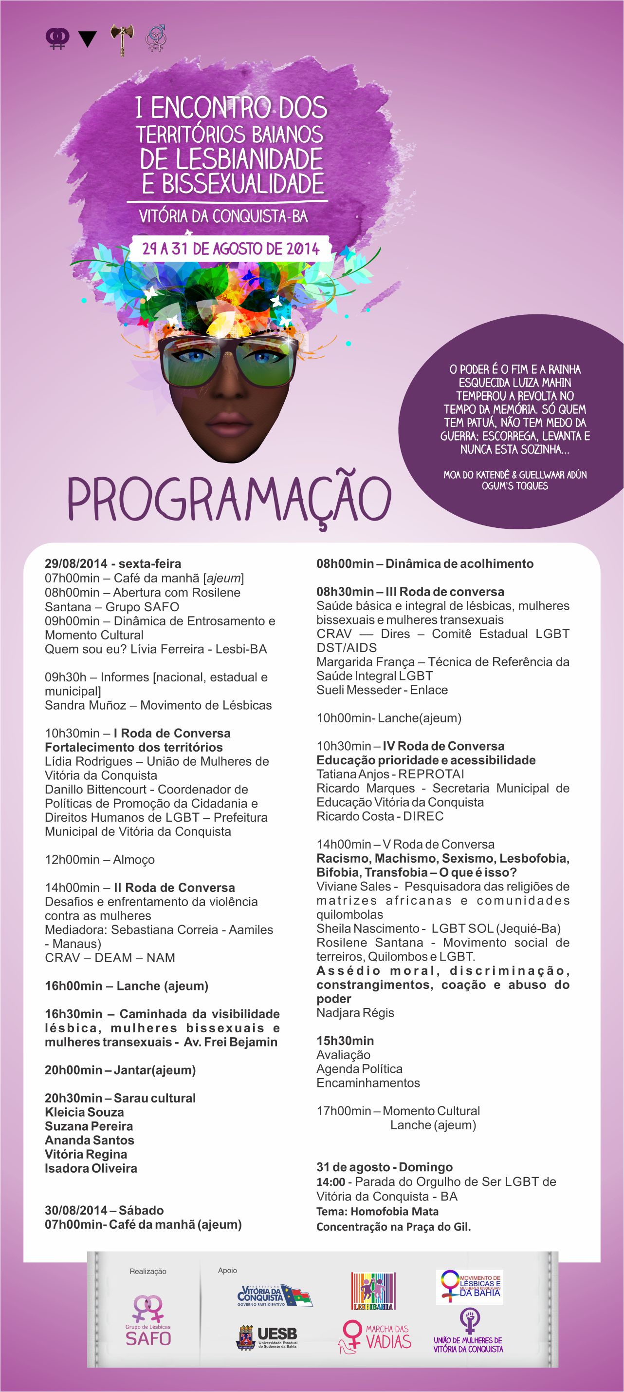 O 1º Encontro dos Territórios Baianos de Lesbianidade e Bissexualidade e a 5ª Parada do Orgulho de ser LGBT são fruto de uma articulação entre militância, academia e poder público. Os eventos têm o apoio da Prefeitura de Vitória da Conquista, por meio da Coordenação Municipal de Políticas de Promoção da Cidadania e Direitos de LGBT, ligada à Secretaria Municipal de Desenvolvimento Social (Semdes).