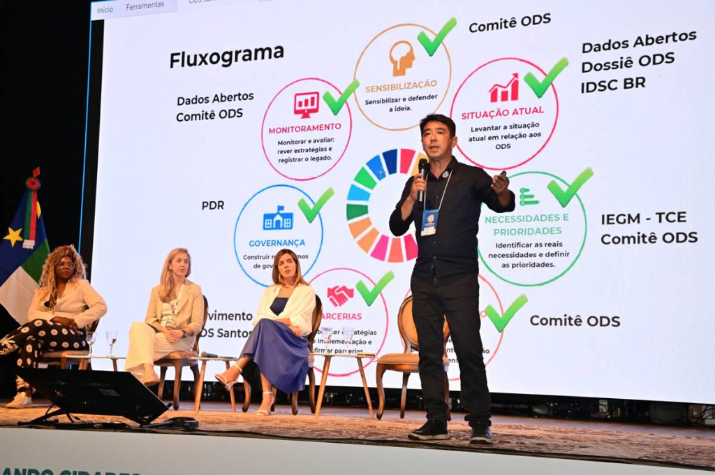 O primeiro painel, intitulado Inovação e Governança Municipal: ODS como Ferramenta de Transformação”, contou com a presença dos representantes da Frente Nacional de Prefeitas e Prefeitos (FNP), Júlia Melo, da Rede Internacional Iclei – Governos Locais pela Sustentabilidade, Rafaella Viana, e do diretor-chefe do Departamento de Políticas para os ODS da cidade de Santos, Fabio Tatsubô.