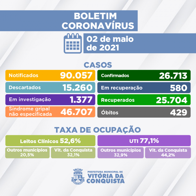 A Secretaria Municipal de Saúde (SMS) confirmou seis novos casos de Covid-19 neste domingo (2), contabilizando 26.713 desde o início da pandemia, com 25.704 recuperados. Outros 580 pacientes estão em recuperação, com 72 internados em Vitória da Conquista e 508 em tratamento domiciliar.