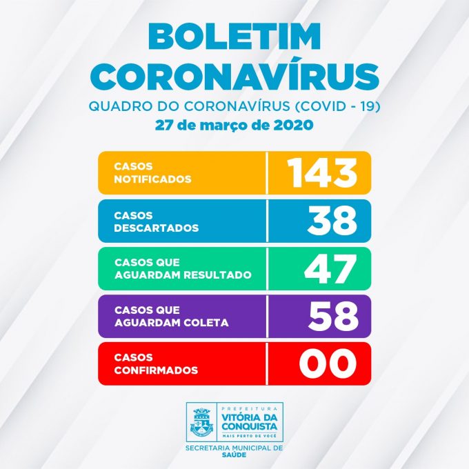 A Secretaria de saúde notificou 143 casos com suspeitas clínica e epidemiológica de infecção pelo Novo Coronavírus (Covid-19) em Vitória da Conquista, até às 17h desta sexta-feira (27). Destes: 38 casos foram descartados, 58 aguardam coleta e nenhum foi confirmado. Os dados são do Boletim Epidemiológico divulgado hoje (27).