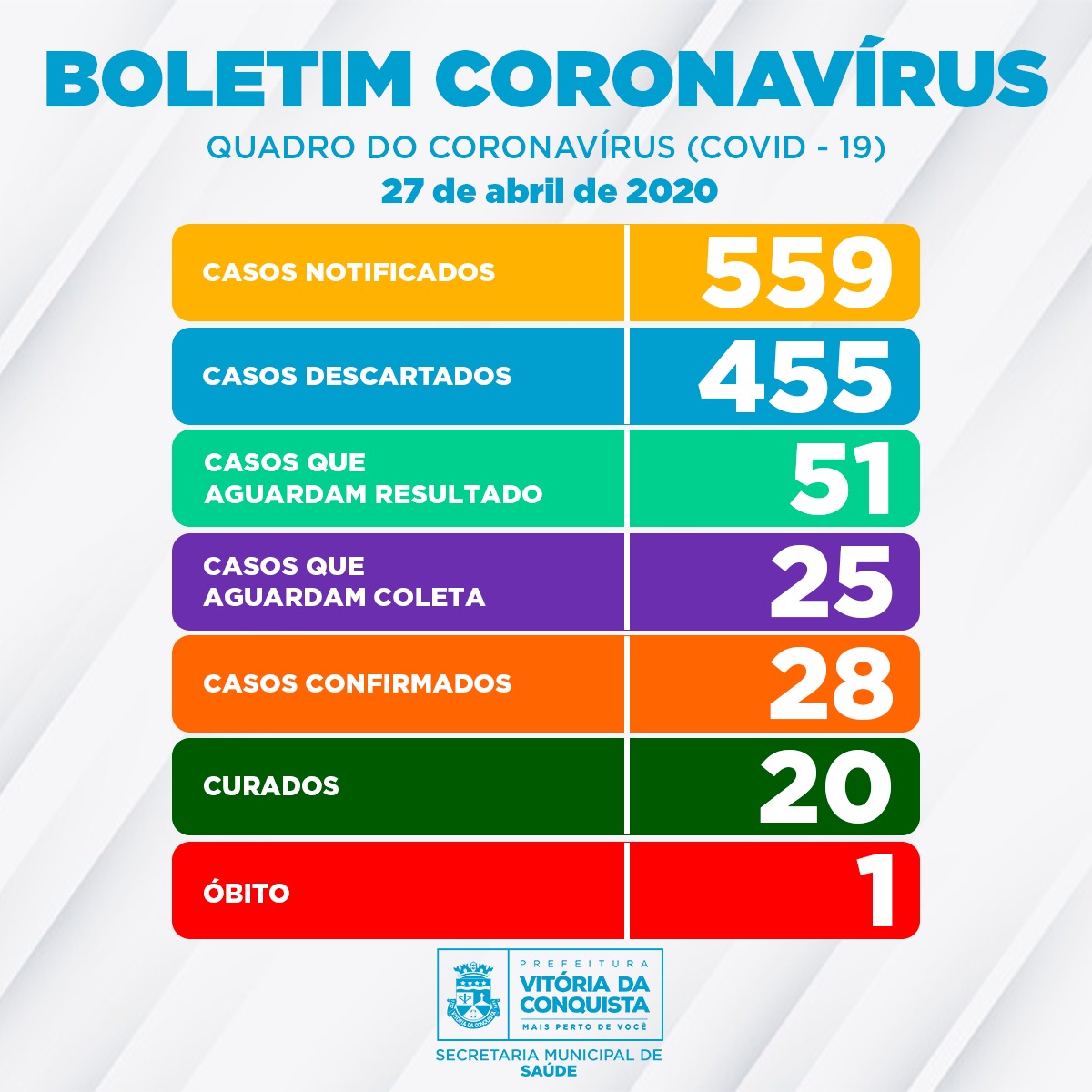 Nesta segunda-feira (27), foram notificados 16 novos casos suspeitos de infecção pelo Novo Coronavírus, totalizando 559 notificações em Vitória da Conquista e 28 casos confirmados até o momento – de acordo com Boletim epidemiológico divulgado pela Secretaria Municipal de Saúde.