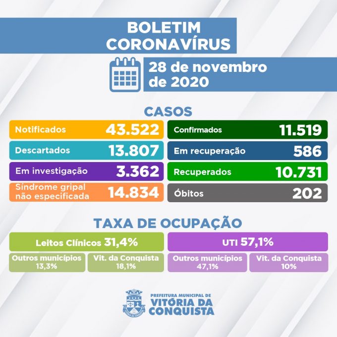 Vitória da Conquista registra até este sábado (28), um total de 11.519 casos confirmados da Covid-19, sendo que 10.731 deles são de pessoas já recuperadas. Outros 586 pacientes diagnosticados com a doença continuam em processo de recuperação (30 internados e 556 em tratamento domiciliar) e 202 moradores do município evoluíram para óbito.