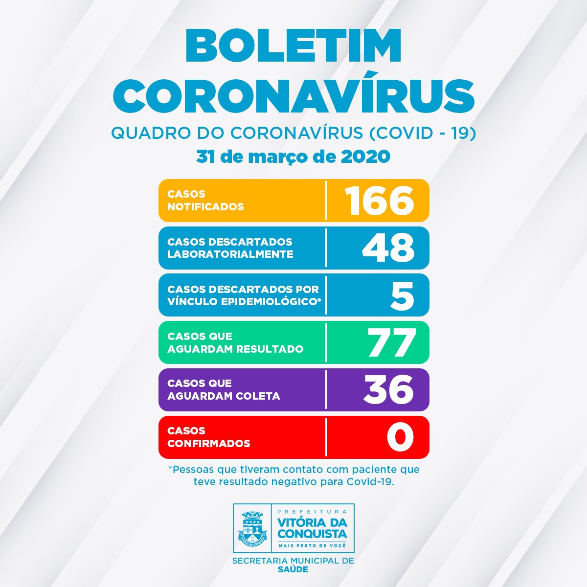 Até às 17h desta terça-feira (31), foram notificados mais 6 casos com suspeita clínica e epidemiológica de infecção pelo Covid-19, totalizando 166 notificações registradas no município desde o dia 27 de fevereiro, quando surgiram os primeiros casos suspeitos.