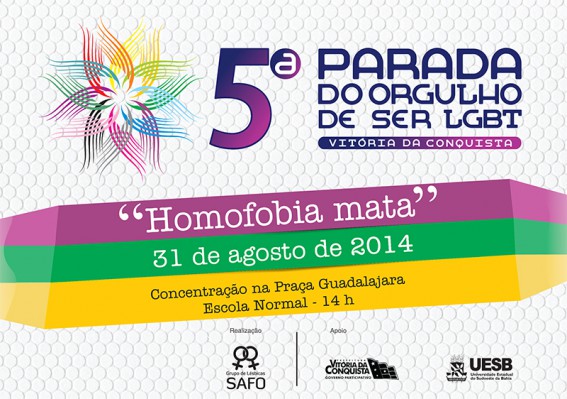 Com o tema “Homofobia mata”, o Grupo de Lésbicas Safo realiza, no dia 31 de agosto, a 5ª Parada do Orgulho de ser LGBT de Vitória da Conquista. O ato já está consolidado como movimento social, político e cultural. A concentração começa às 14 horas, na praça Guadalajara (popularmente conhecida como Praça da Normal), de onde terá início o percurso. A expectativa da organização é reunir cerca de seis mil pessoas.