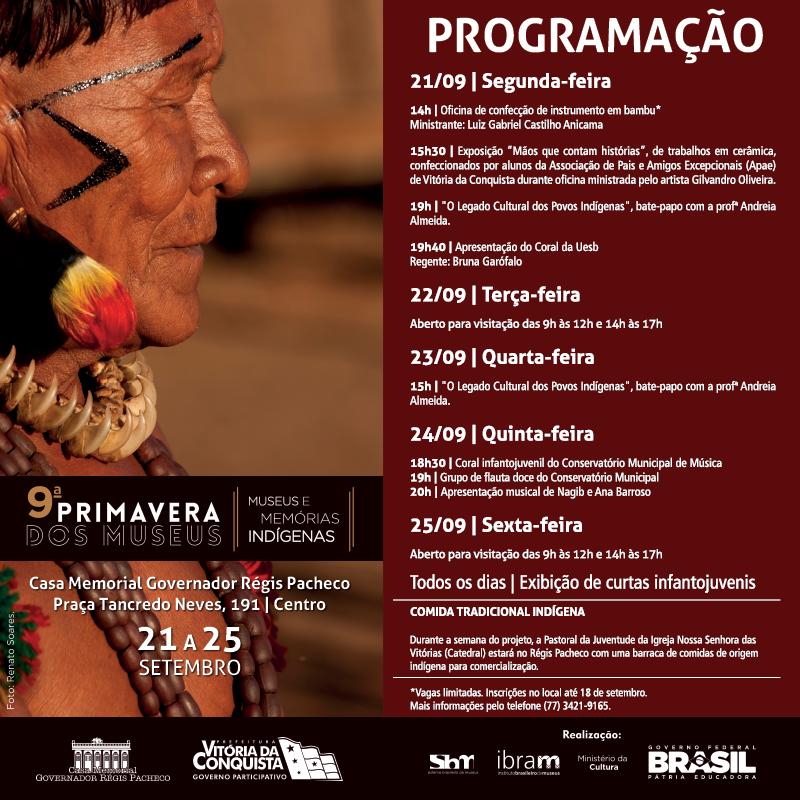A Prefeitura de Vitória da Conquista, por meio da Secretaria Municipal de Cultura, Turismo, Esporte e Lazer, em parceria com a Pastoral da Juventude da Paróquia Nossa Senhora das Vitórias, apresenta o projeto “Índio do Brasil: a seiva desse chão”. O momento compõe a programação da 9ª Primavera dos Museus, promovida pelo Instituto Brasileiro de Museus (Ibram) – autarquia federal vinculada ao Ministério da Cultura (MinC) – , que este ano terá atividades desenvolvidas em torno do tema “Museus e Memórias Indígenas”.