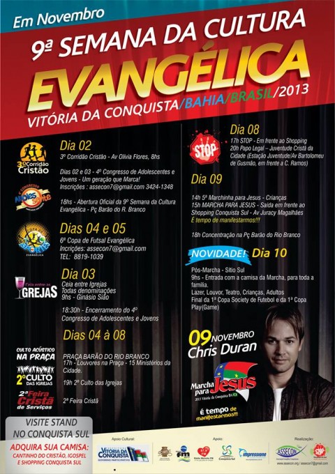 Com o tema “É Tempos de Manifestarmos”, a Marcha terá a presença do cantor Chris Durán. “A Marcha 2013 levará para as ruas de Conquista um povo alegre e consciente da responsabilidade que temos como cristãos, de estarmos abençoando toda a cidade através de nossa ações”, declarou o organizador do evento, Pr. Orlando Filho.