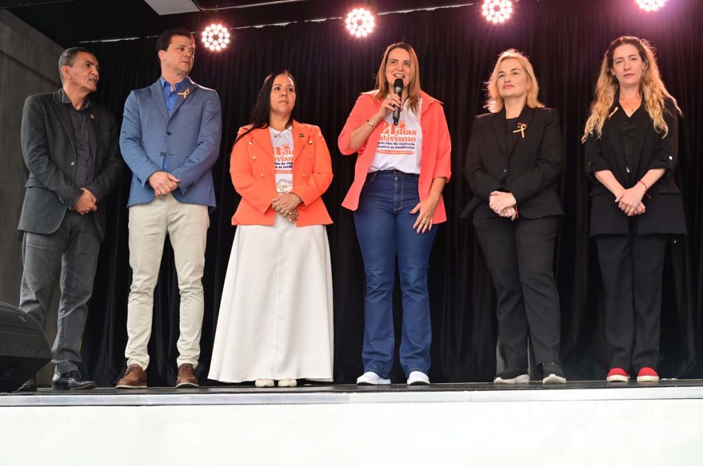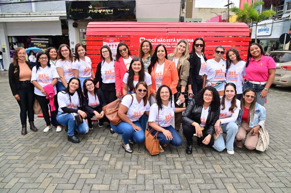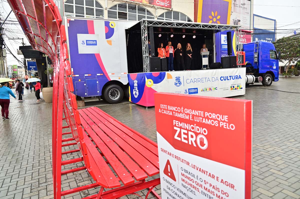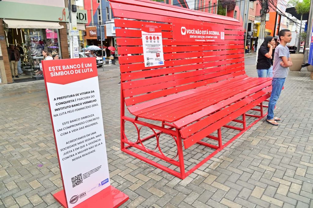 A Prefeitura de Vitória da Conquista, por meio da Secretaria Municipal de Políticas para Mulheres (SMPM), realizou, nesta quinta-feira (27), a abertura oficial da campanha “21 Dias de Ativismo pelo Fim da Violência contra as Mulheres”, uma iniciativa internacional que busca promover o respeito, a igualdade e o enfrentamento de todas as formas de violência de gênero. O destaque foi a adesão do município ao Instituto Banco Vermelho, tornando-se o primeiro da Bahia a integrar a campanha que simboliza o sangue derramado das mulheres vítimas de violência e busca a meta de “Feminicídio Zero”. Um banco gigante, semelhante aos de praça, foi instalado na Praça Nove de Novembro, convidando a população a “sentar e refletir, levantar e agir”.