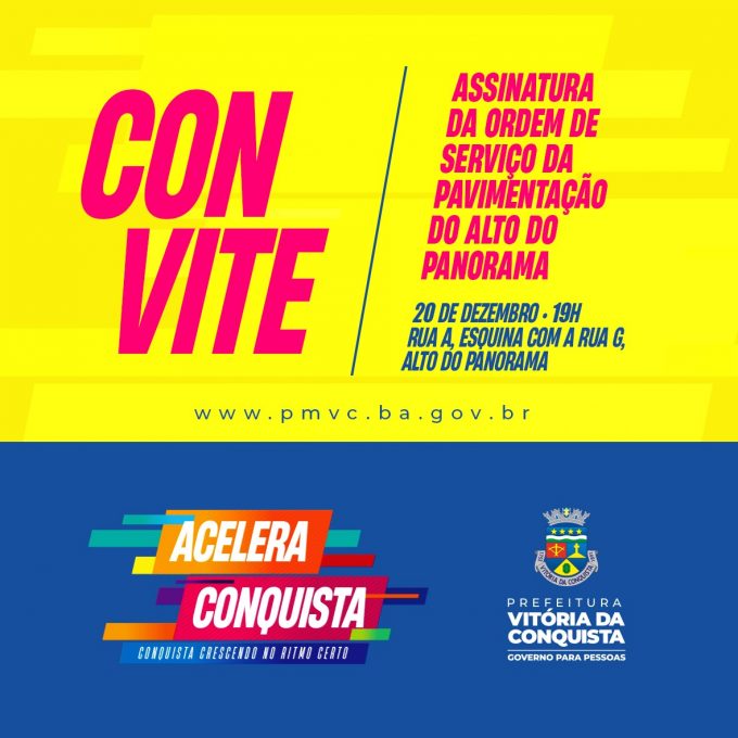 No próximo dia 20, a Prefeitura dará mais um importante passo na melhoria da infraestrutura dos bairros de Vitória da Conquista, por meio do Acelera Conquista, maior programa de investimentos do município. A prefeita Sheila Lemos vai assinar a Ordem de Serviço para a pavimentação e requalificação de 37 ruas do Alto do Panorama. O loteamento será o primeiro a receber as obras de pavimentação, que também irão contemplar o Bateias II, Cidade Modelo, Jardim Guanabara e Porto Seguro.