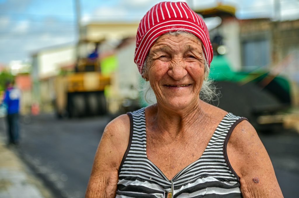 Enquanto saía na porta de casa, dona Terezinha observava a aplicação do asfalto. Moradora da Avenida Ilhéus há mais de 20 anos, ela não escondia a felicidade de ver a requalificação asfáltica no bairro Alegria.