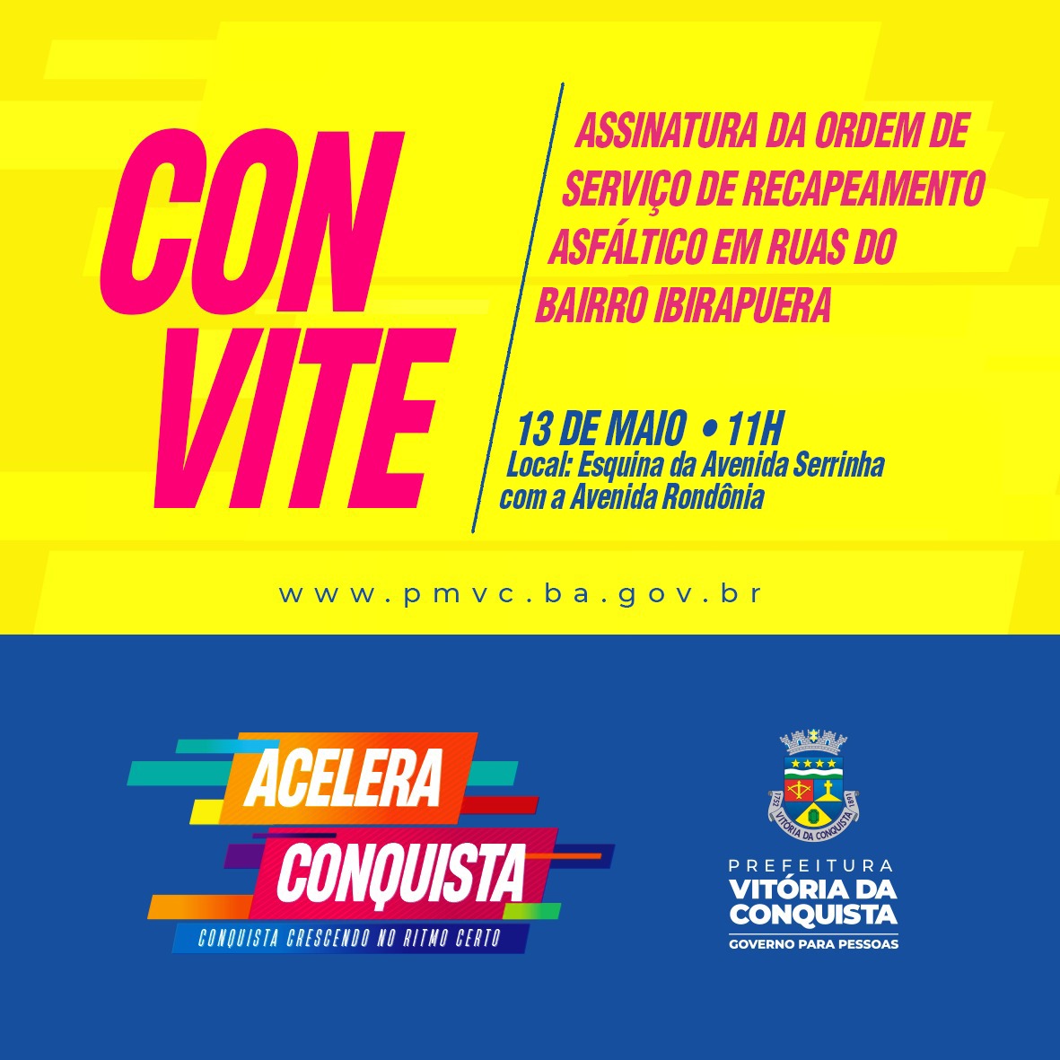Com homens e máquinas trabalhando por toda a cidade, a Prefeitura de Vitória da Conquista vai iniciar mais uma obra: o recapeamento asfáltico em ruas do bairro Ibirapuera. A assinatura da Ordem de Serviço acontece nesta segunda-feira (13), às 11h, na esquina da Avenida Serrinha com a Avenida Rondônia.