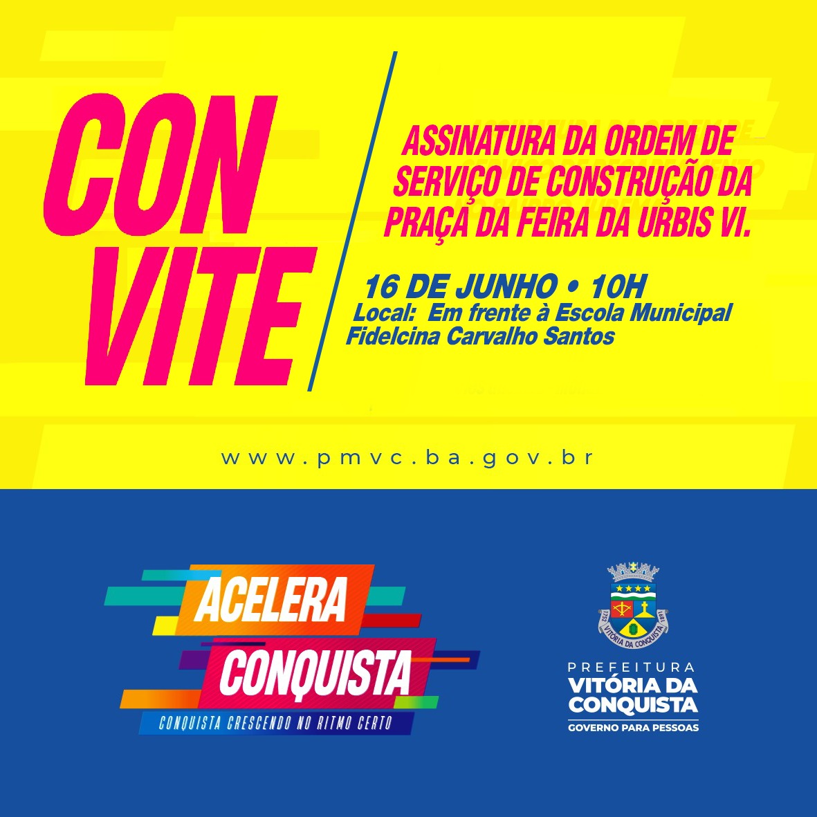 Atenção, moradores da Urbis VI e imediações! Neste domingo (16), às 10h, em frente à Escola Municipal Professora Fidelcina Carvalho Santos, a Prefeitura de Vitória da Conquista assina a Ordem de Serviço para a construção da Praça da Feira da Urbis VI. A obra está inserida no maior programa de investimento na infraestrutura de Vitória da Conquista, o Acelera Conquista.