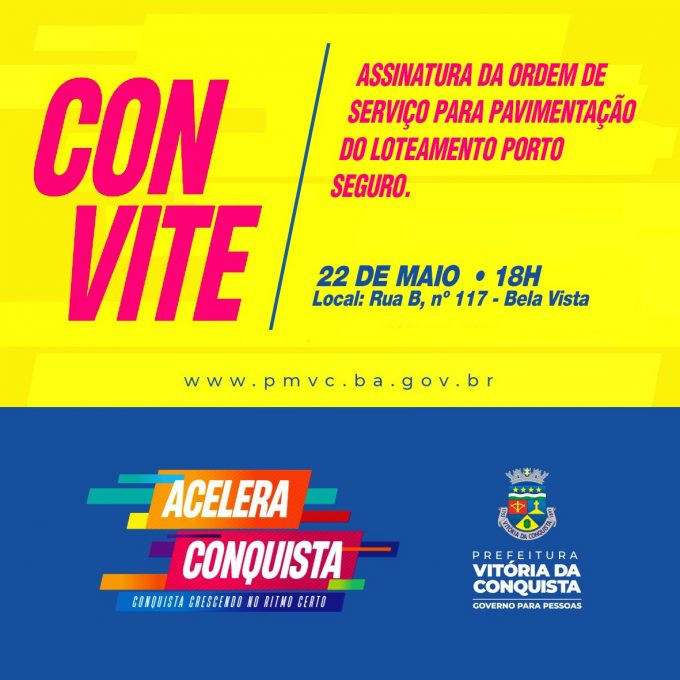 Atenção, moradores do loteamento Porto Seguro! O sonho do asfalto está próximo de se tornar realidade. A Prefeitura de Vitória da Conquista assina a Ordem de Serviço para início das obras de pavimentação das ruas nesta quarta-feira (22), às 18h, na Rua B, bairro Bela Vista.