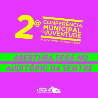 Logo mais, no auditório da Secretaria Municipal de Trabalho, Renda e Desenvolvimento Econômico (Semtre), às 19h, tem início a 2ª Conferência Municipal de Juventude. Sob o tema “As várias formas de mudar o Brasil”, cerca de 200 jovens discutirão temas de interesse para essa parcela da população e, no sábado, votarão 22 propostas que serão defendidas pelos 20 delegados que representarão Vitória da Conquista na etapa territorial.