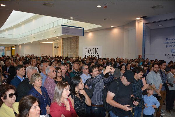 Uma multidão acompanha a inauguração do shopping