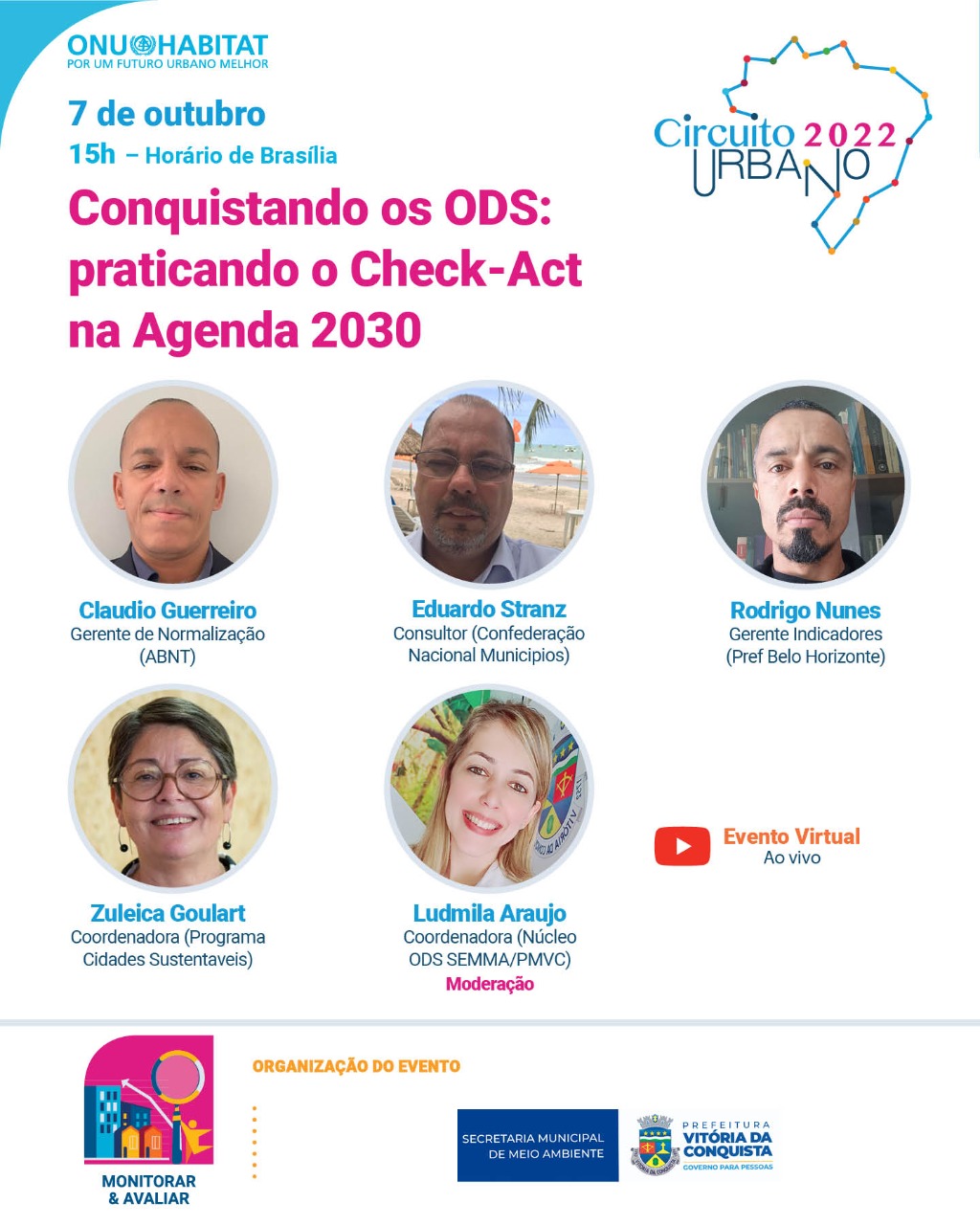 A programação dos webinários continua nesta quinta-feira (6), a partir das 9h, no canal da ONU Habitat no Youtube , com o tema “Conquistando os ODS: planejamento integrado para implementação dos ODS”. Já na sexta (7), às 15h, será o momento de discutir “Praticando o Check-Act na efetividade da implantação da Agenda 2030”. Quem tiver interesse no assunto é convidado a participar.