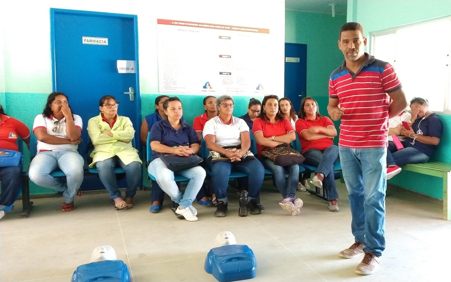 Durante a capacitação, o instrutor do Samu 192, Vailson Lopes, falou sobre os primeiros socorros no caso de emergências, como engasgos de adultos e de crianças e de parada cardiorrespiratória. Esses casos podem ocorrer na rotina de trabalho dos agentes, inclusive nas salas de espera das Unidades de Saúde. Segundo o instrutor, conhecer essas situações e saber como aplicar corretamente os primeiros socorros pode evitar que os pacientes venham a ter complicações mais graves ou até chegar a óbito.