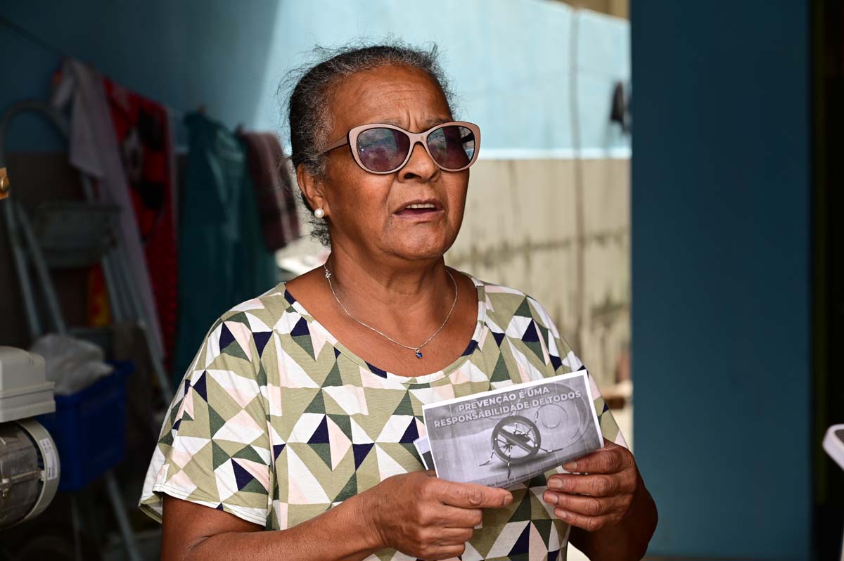 Maria Iris Alves dos Santos, de 65 anos, recebeu bem o agente comunitário e explicou que em sua casa o mosquito não tem vez. “Aqui eu tenho cuidado com minhas plantas, não deixo nenhum pratinho com água, a caixa d’água do alto está bem fechada, o meu túnel de água bem fechado, sempre olho no fundo da geladeira pra ver se tem água acumulada. Na última visita do agente de endemias, ele disse que eu estava de parabéns e o meu lixo está sempre organizado, só coloco na porta no dia coleta”.