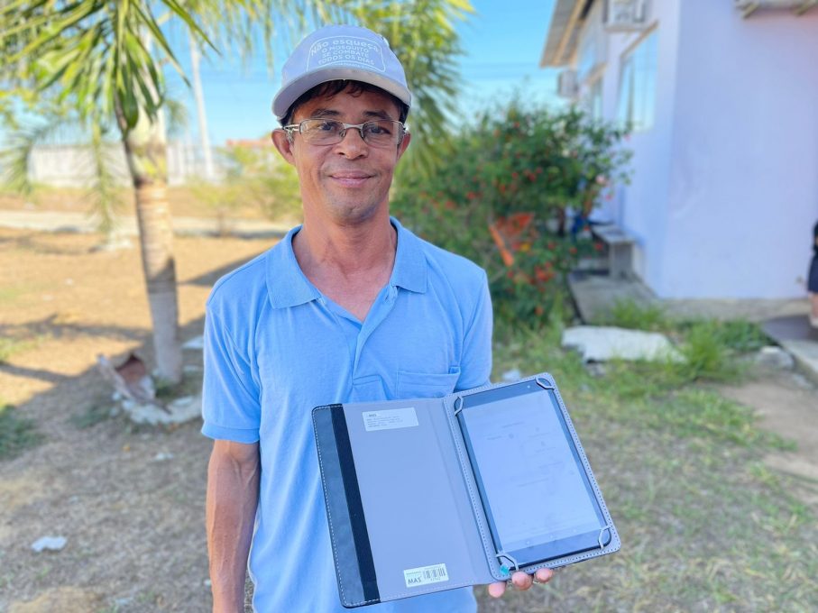 Hélio Santos, agente de endemias há 23 anos, ficou feliz ao receber a nova ferramenta que vai otimizar o seu trabalho, deixando de lado o preenchimento manual que era feito anteriormente. “O tablet veio para ajudar a gente nesse trabalho e temos que acompanhar a tecnologia, porque isso auxilia na rotina de visitas”, ressaltou ele.