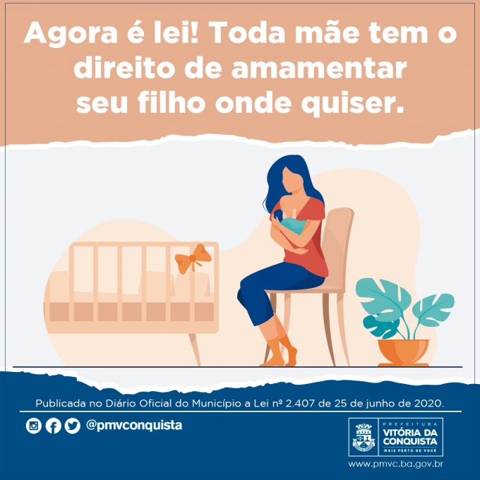A partir de agora, está assegurado à lactante o direito de amamentar em estabelecimentos de uso coletivo, públicos ou privados. A Lei nº 2.407/20 foi sancionada nesta quinta-feira (25), pelo prefeito Herzem Gusmão, e já está em vigor.