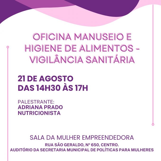 A Secretaria Municipal de Políticas para Mulheres, através da Coordenação de Autonomia e Sala da Mulher Empreendedora, em parceria com a Vigilância Sanitária promovem oficina de manuseio e higiene de alimentos. A oficina será ministrada pela nutricionista Adriana Prado e acontece nesta quarta-feira (21), no auditório da Secretaria Municipal de Políticas para Mulheres, das 14h30 às 17h.
