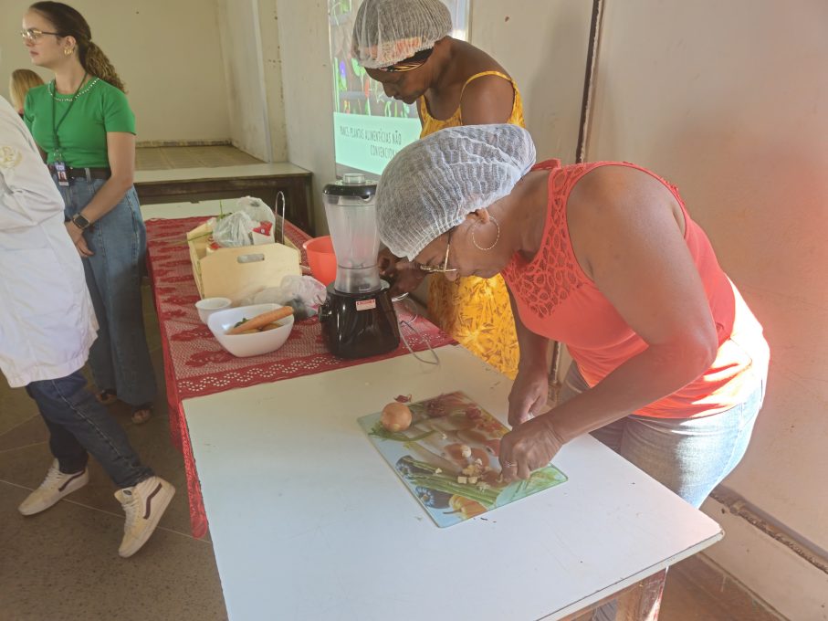 As agricultoras Maria de Fátima Silva e Giovania Castro foram escolhidas para auxiliar a nutricionista durante a execução da receita. “Trabalho na horta do Kadja há cerca de seis anos e, apesar de conhecer algumas das plantas, eu não sabia que elas eram comestíveis e que tinham tantas utilidades. Aprendi muito hoje”, relatou Giovania. Já Maria de Fátima achou as PANCs muito saborosas. “Amei a oficina, a torta estava deliciosa, já tenho um pé de Ora-pro-nóbis, então vou poder refazer a receita na minha casa”.