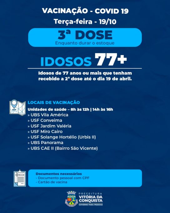 Poderão tomar a 3ª dose idosos de 77 anos ou mais que tenham recebido a 2ª dose até o dia 19 de abril e imunossuprimidos portadores de doenças graves, que tenham tomado a 2ª ou a dose única até o dia 20 de setembro.