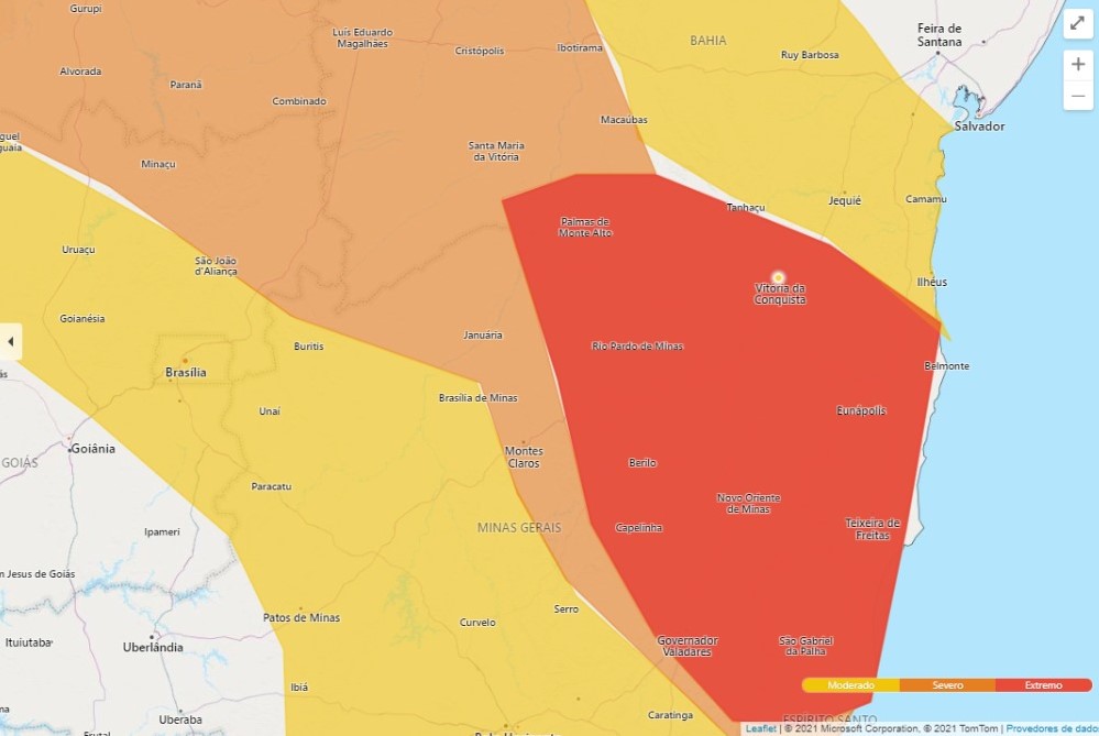 No mapa abaixo, as áreas em amarelo identificam alerta moderado, a laranja perigo severo e vermelho, onde está Vitória da Conquista, perigo extremo.