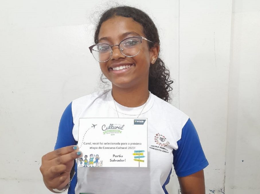 Os alunos da rede municipal de Vitória da Conquista continuam a “voar” mais alto. Na tarde desta terça-feira (31), Maria Carolina Oliveira Paiva, aluna do 5º ano da Escola Municipal Conquista Criança, foi selecionada em 1º lugar na etapa regional do concurso cultural do Sistemas de Cooperativas Financeiras do Brasil (Sicoob) Credcoop. O texto narrativo produzido por ela (crônica) vai concorrer, agora, à etapa nacional, que acontece no mês de dezembro, em Brasília.