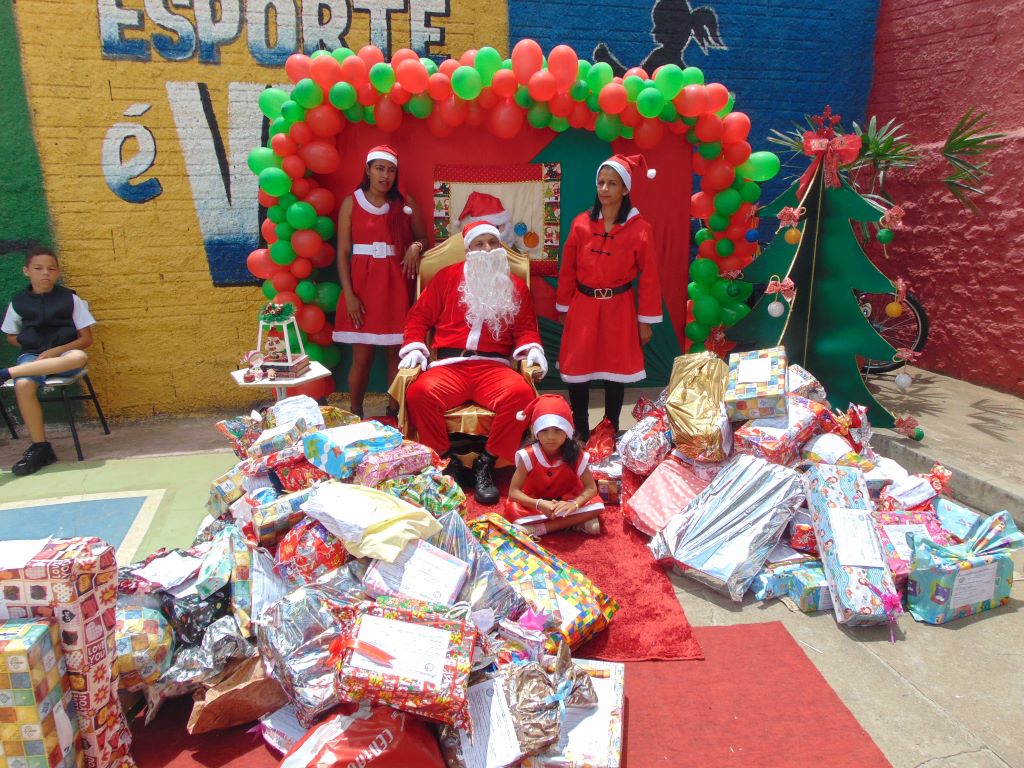 Os alunos da Escola Municipal Nossa Senhora Aparecida estavam radiantes e transmitindo alegria, ontem (20), quando o Papai Noel dos Correios visitou a unidade distribuindo presentes e desejando Feliz Natal a todos. A escola foi incluída pelos Correios na campanha “Projeto Papai dos Correios”, depois que a Secretaria Municipal de Educação (Smed) informou sobre a situação sócio econômica das crianças das diversas unidades escolares do município.