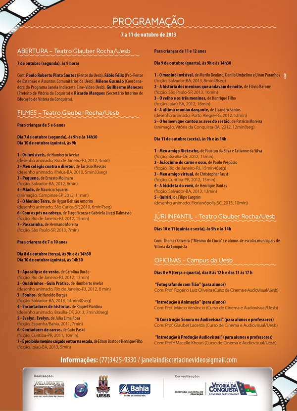 Realização – A Mostrinha de Cinema Infantil de Vitória da Conquista acontece desde outubro de 2010. O evento é realizado pela Universidade Estadual do Sudoeste da Bahia, por meio da Pró-Reitoria de Extensão e do Programa Janela Indiscreta Cine-Vídeo Uesb, com a correalização da Prefeitura de Vitória da Conquista, por meio da Secretaria Municipal de Educação.