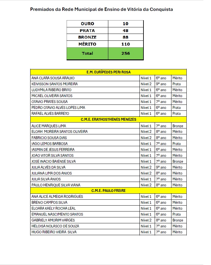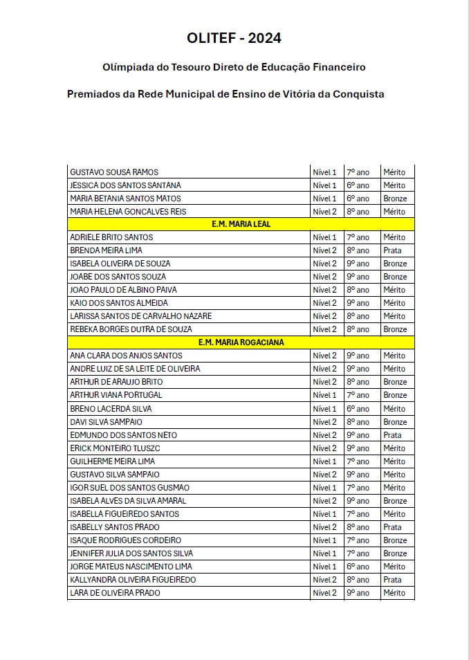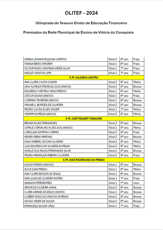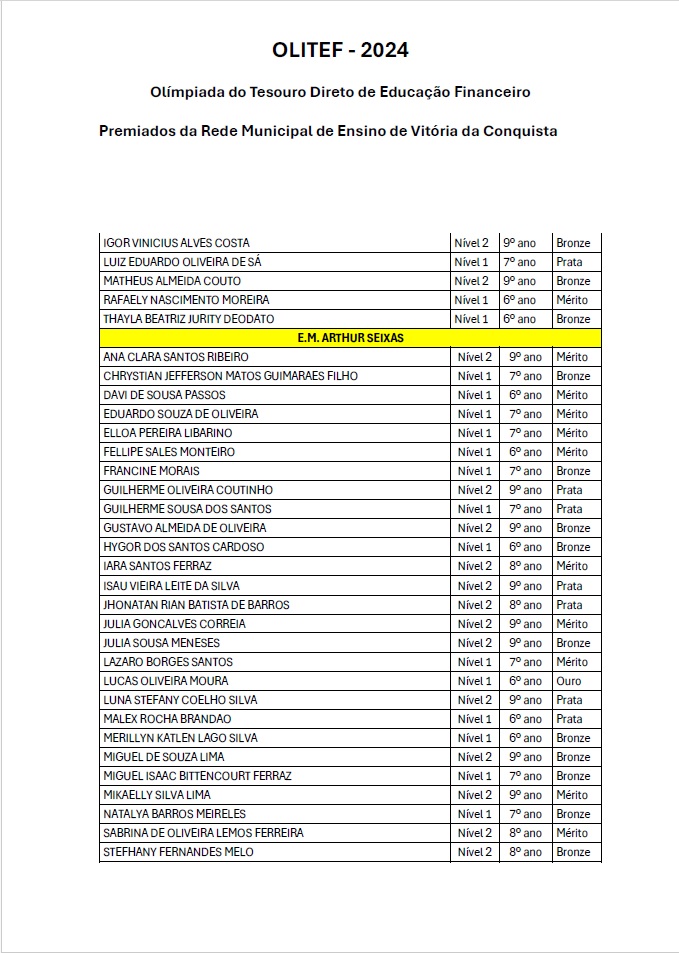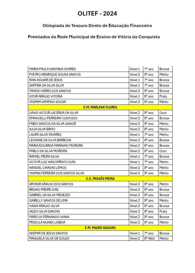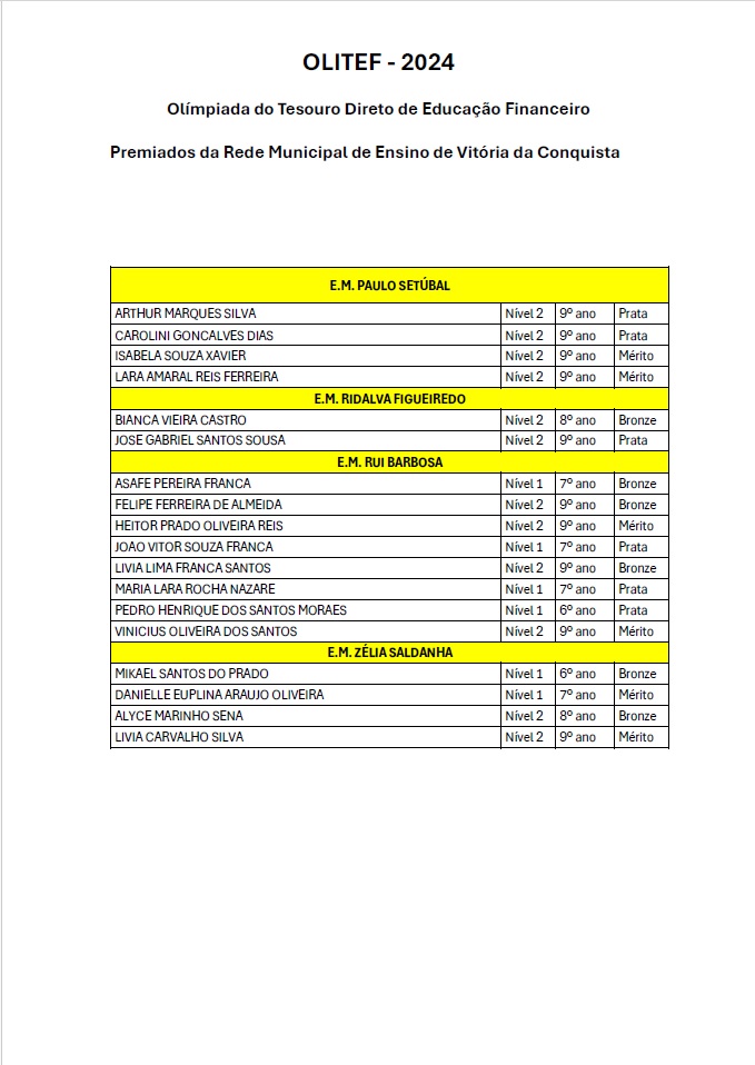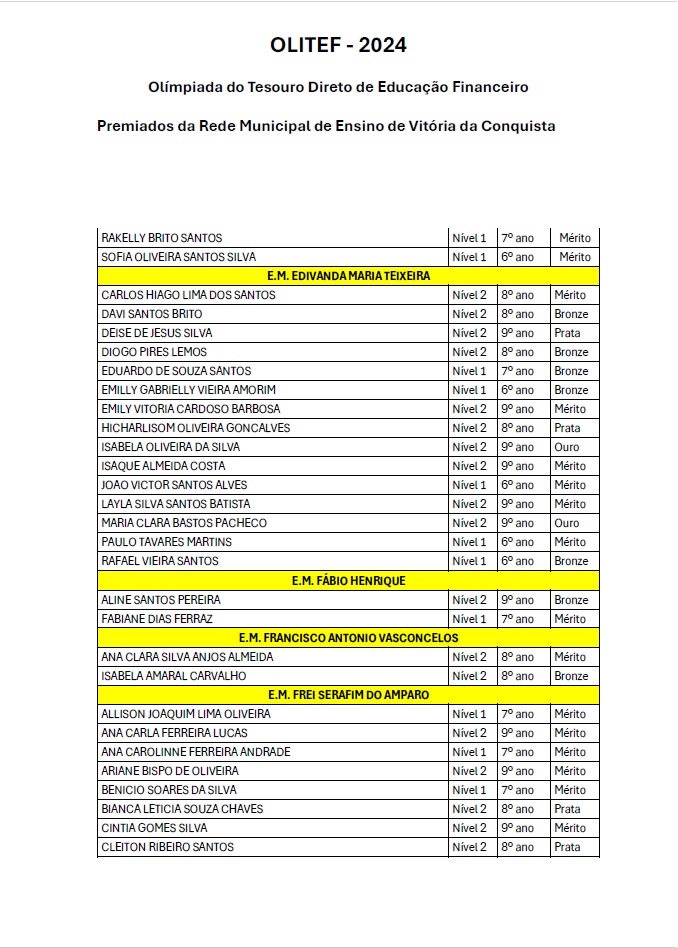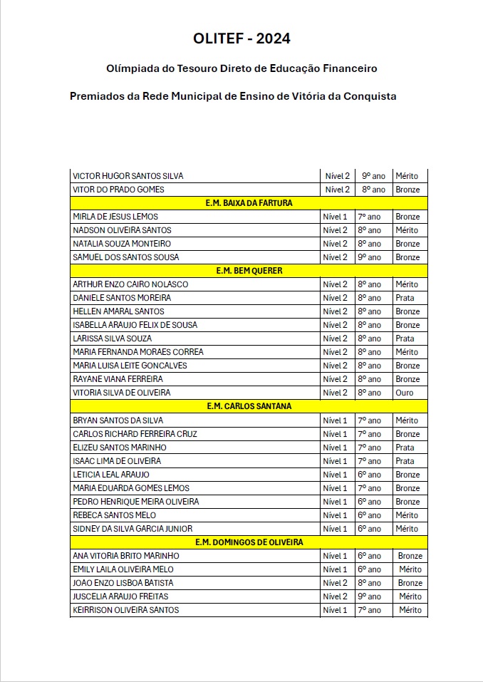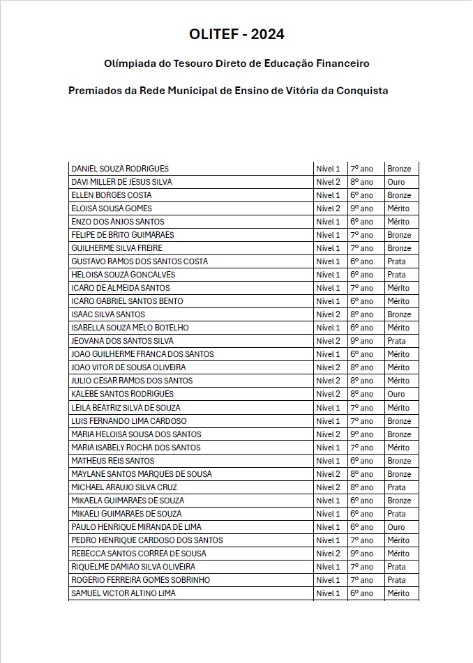 Os alunos da Rede Municipal de Vitória da Conquista continuam a fazer bonito nas competições nacionais de conhecimento. Na Olimpíada do Tesouro Direto de Educação Financeira (Olitef), 256 alunos do município foram premiados, dos quais, nove da Escola Municipal Vicente Cassimiro (Bem Querer).