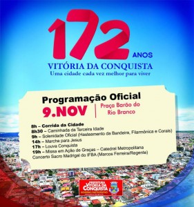 Para comemorar os 172 anos de emancipação política de Vitória da Conquista, a Prefeitura Municipal realiza, na próxima sexta-feira, 9, uma programação especial. As atividades têm início às 8h30 com a tradicional Corrida da Cidade, promovida pela Secretaria de Cultura, Turismo, Esporte e Lazer. O percurso terá, aproximadamente, 7 km e a largada será na Praça Barão do Rio Branco.