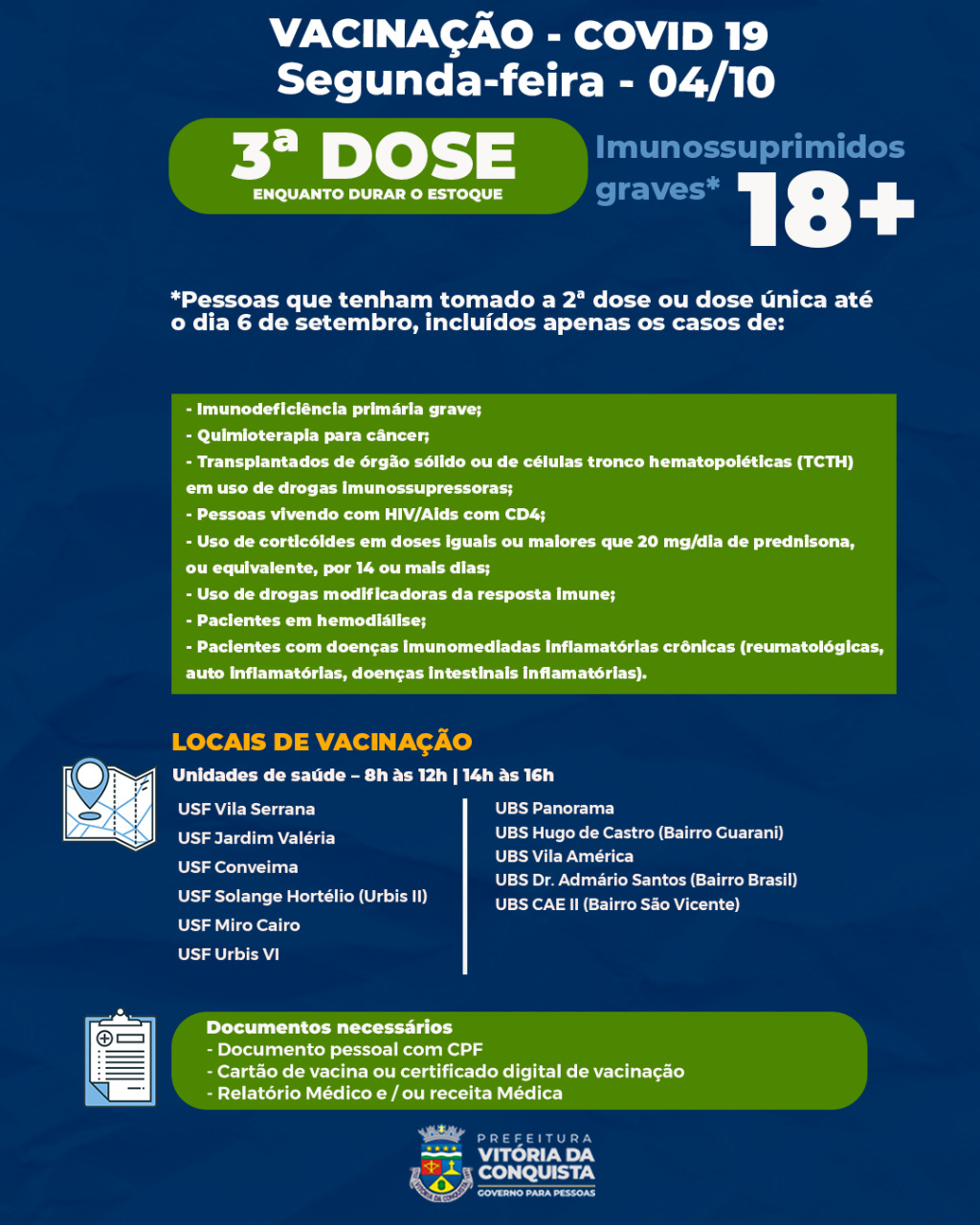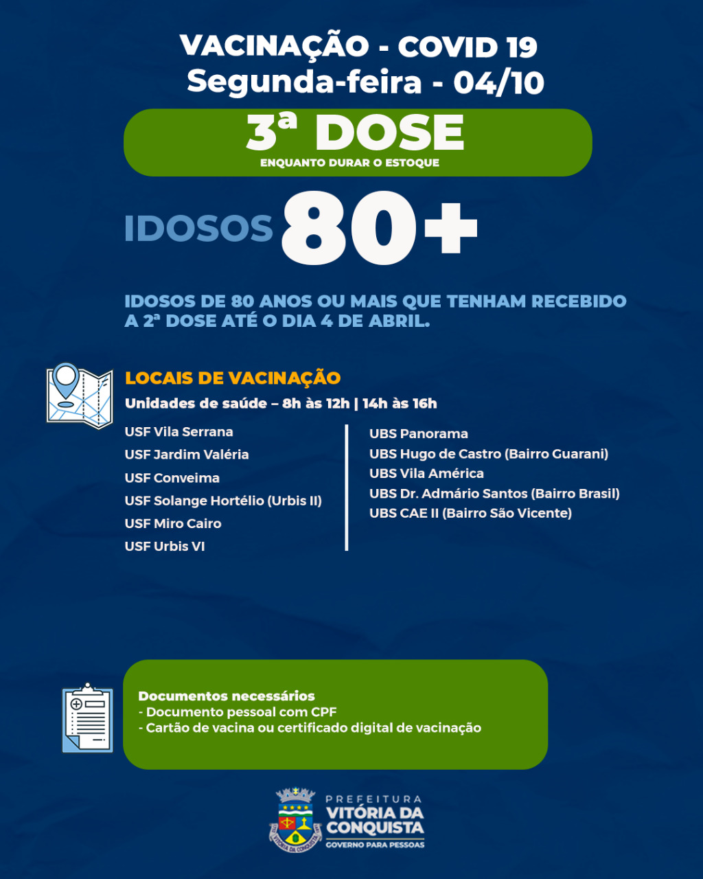 A 3ª dose estará disponível em 11 unidades de saúde, atendendo aos idosos de 80 anos ou mais que tomaram a 2ª dose até o dia 4 de abril, e aos imunossuprimidos graves com 18 anos ou mais, que tenham recebido a 2ª dose até o dia 6 de setembro. Veja quais unidades estarão aplicando a dose de reforço: