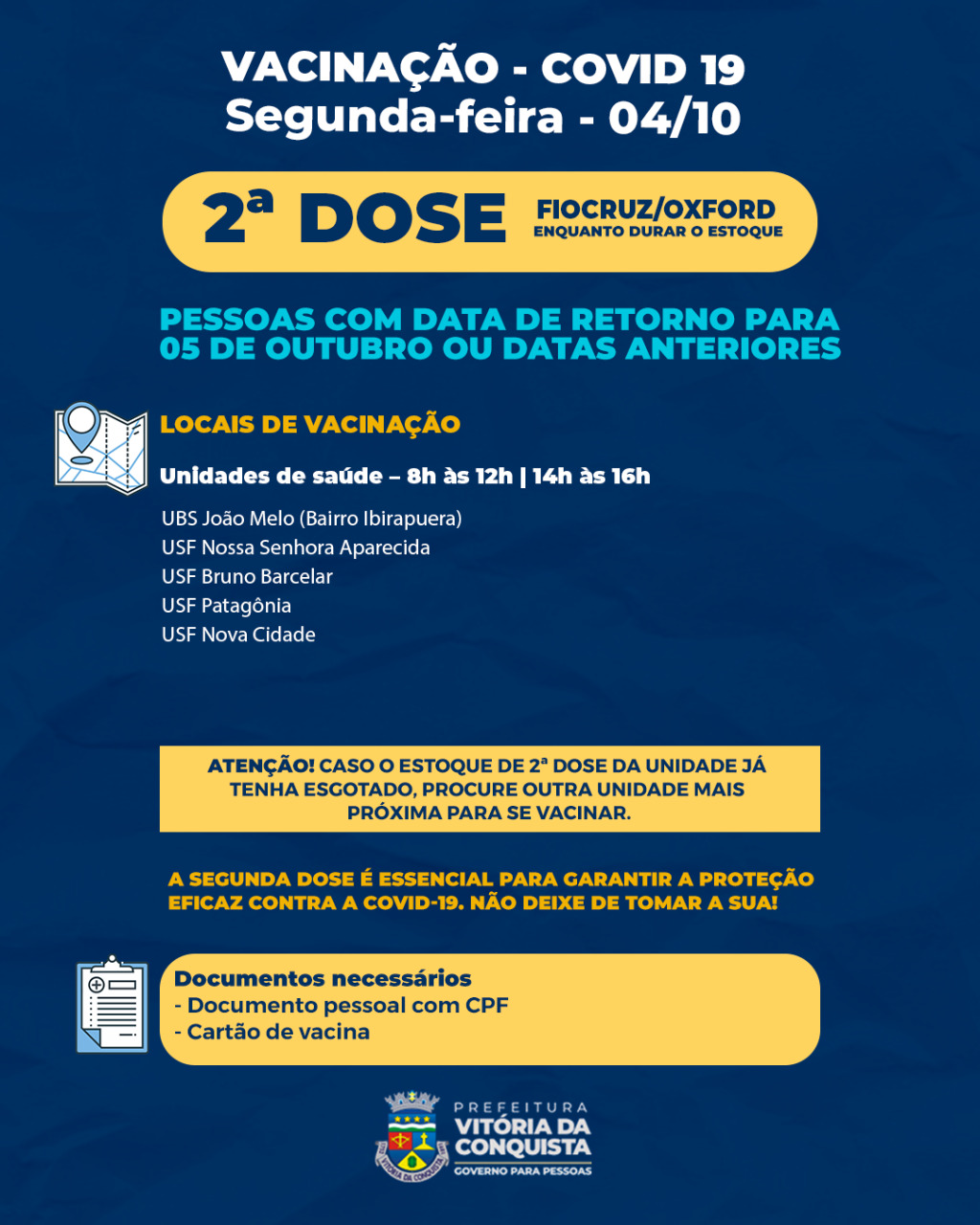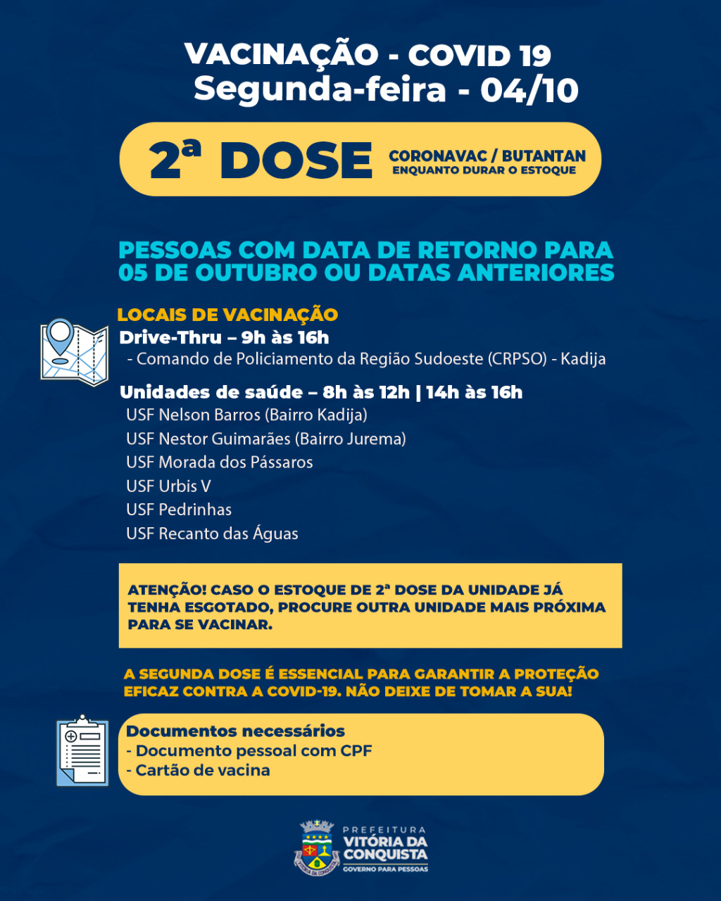 As pessoas que precisam tomar a 2ª dose da Pfizer, CoronaVac/Butantan ou AstraZeneca/Fiocruz e estão com data de retorno agendada para o dia 5 de outubro ou datas anteriores, devem observar no cartão de vacina. Também estará funcionando um drive-thru no Comando de Policiamento da Região Sudoeste (CPRSO), no bairro Kadija, para aplicação da 2ª dose da Coronavac/Butantan.