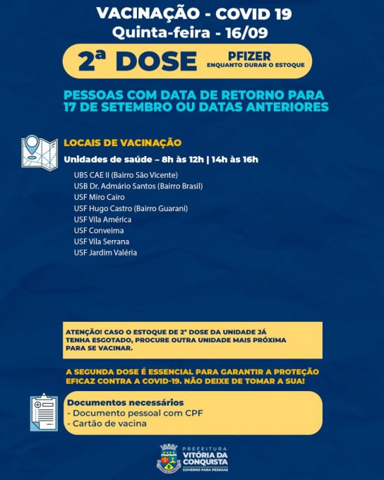 A 2ª dose da Pfizer será aplicada no horário das 8h às 12h e das 14h às 16h, apenas nas unidades de saúde: UBS CAE II (Bairro São Vicente), USB Dr. Admário Santos (Bairro Brasil), UBS Vila América, USF Miro Cairo, USF Hugo Castro (Bairro Guarani), USF Conveima, USF Vila Serrana e USF Jardim Valéria.