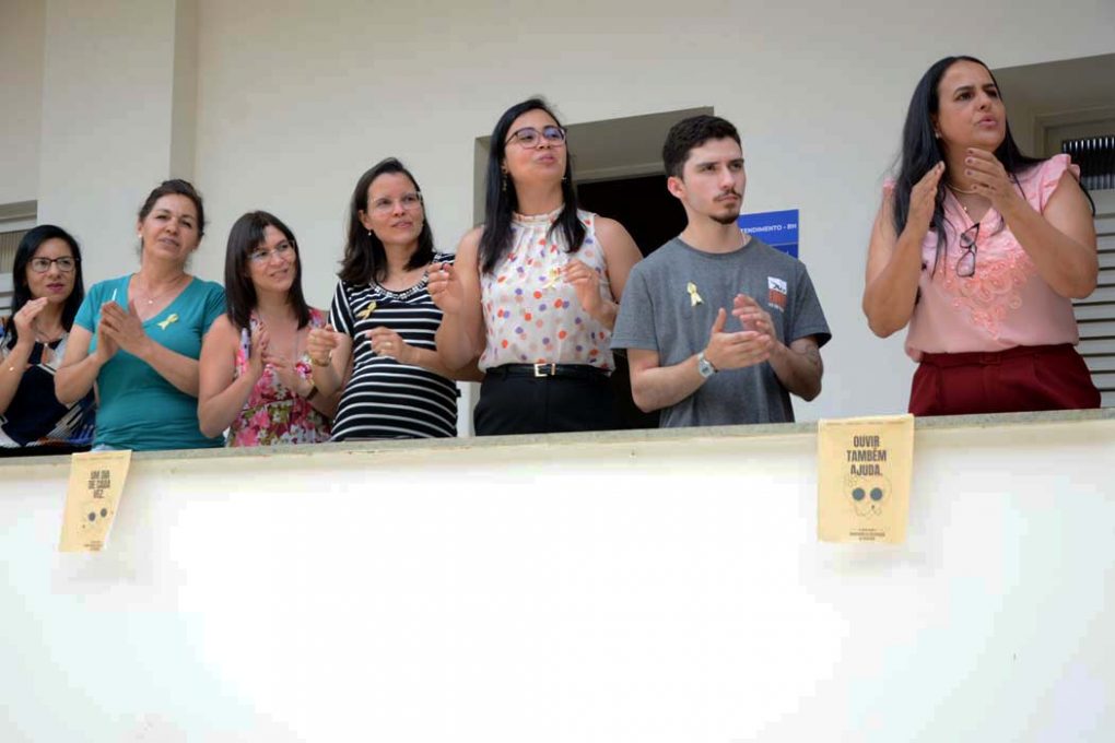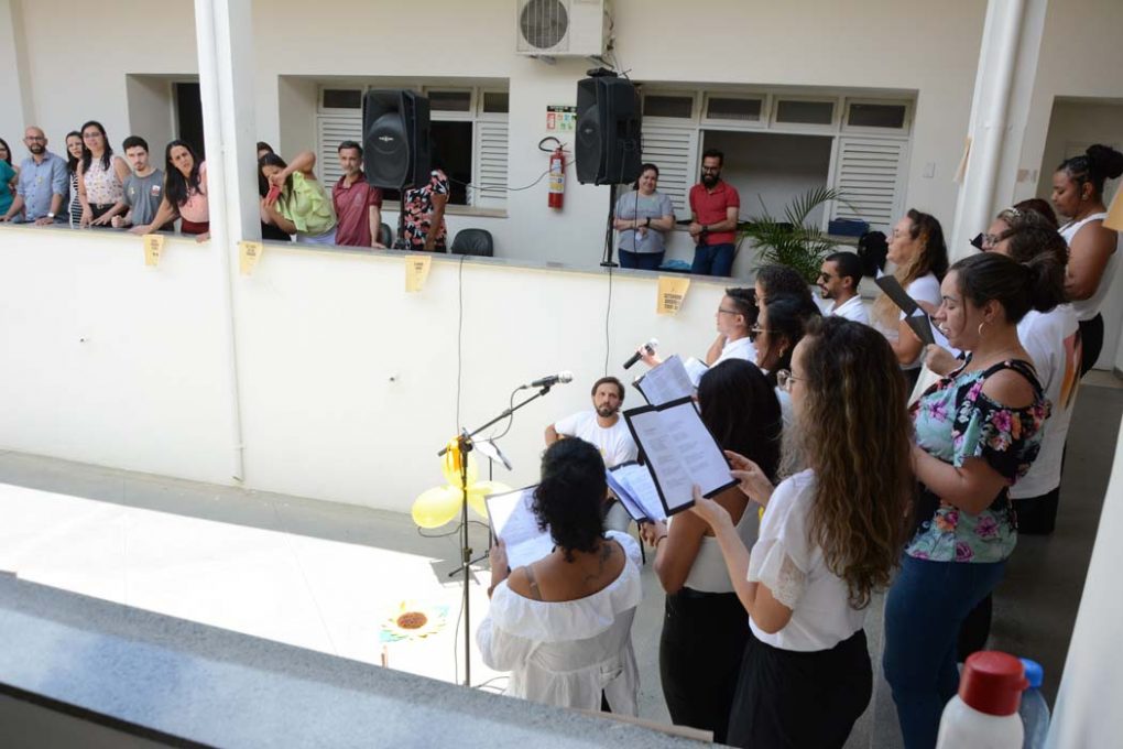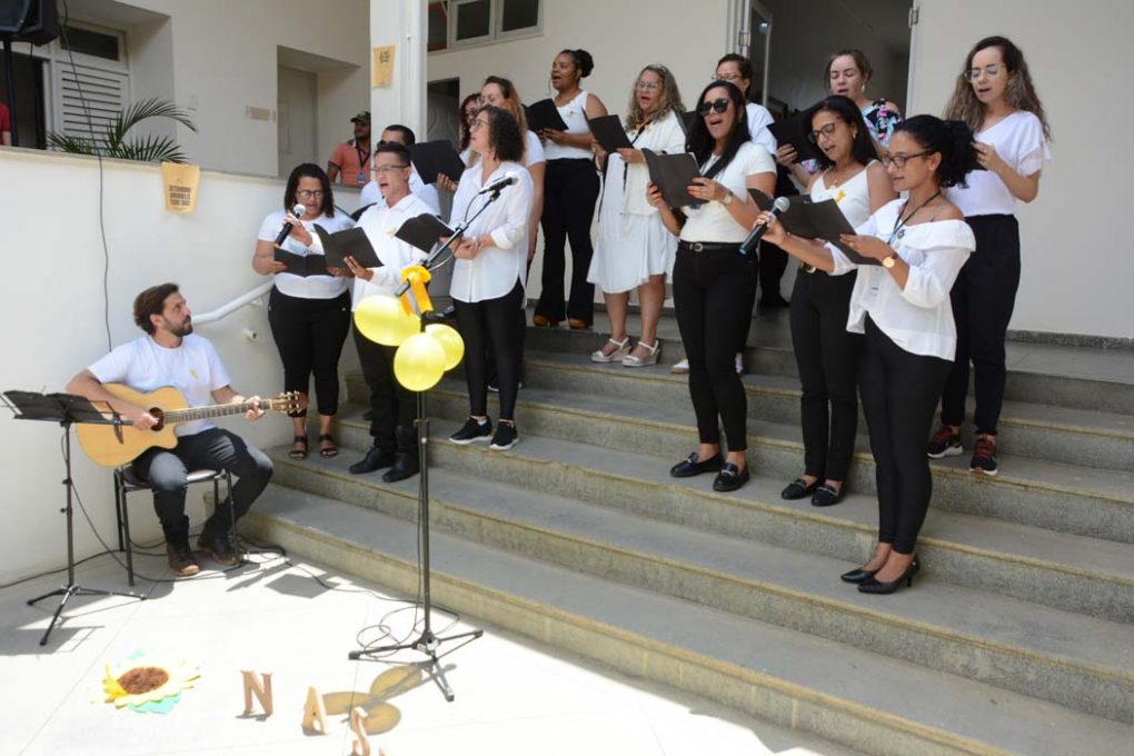 Encerrando as atividades do Setembro Amarelo, a Secretaria Municipal de Gestão e Inovação (Semgi) promoveu nesta sexta-feira (29), a apresentação do coral dos servidores municipais, criado há dois meses. Nas escadarias do prédio da Prefeitura, 15 servidores cantaram e acalentaram os demais colegas e a prefeita Sheila Lemos, que, ao ouvir o som, deu uma pausa nos despachos administrativos, e se juntou ao grupo.