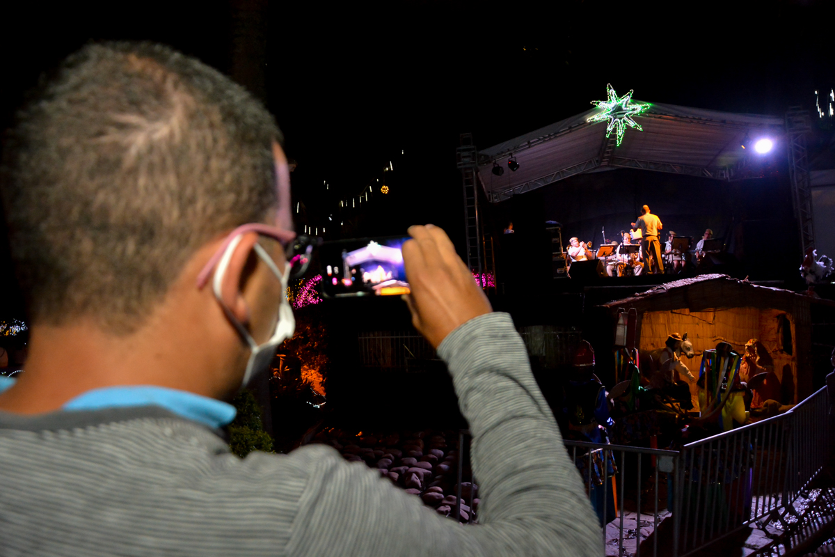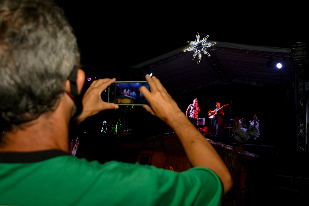Em meio ao vai e vem das pessoas, uma cena chamava a atenção na noite desta segunda-feira (20). Sentado em um banco da Tancredo Neves e com seu violão nas mãos, o músico amador Omero Moreira não desviava o olhar do palco montado sobre a cascata da praça. Era o terceiro dia de apresentações culturais do Natal Conquista de Luz, promovido pela Prefeitura, que agradou em cheio a Omero e aos demais visitantes.