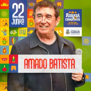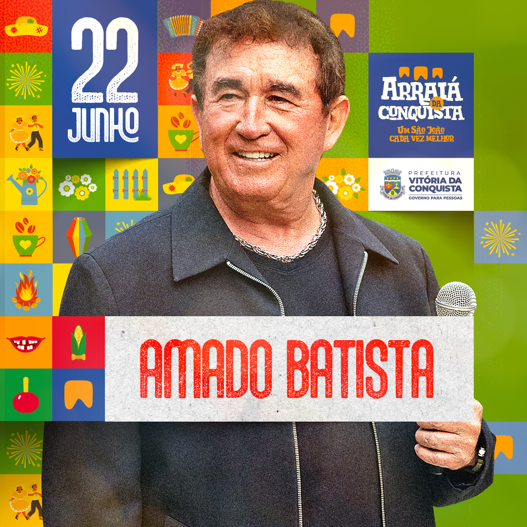 O cantor mais amado do Brasil retorna a Vitória da Conquista para subir ao palco do Arraiá da Conquista e encerrar o último dia de festa por volta de 1h, no Centro Cultural Glauber Rocha. Neste ano, o artista comemora 49 anos de uma trajetória marcada por números impressionantes: mais de 38 milhões de discos vendidos e mais de três bilhões de visualizações em plataformas digitais. O artista já recebeu centenas de prêmios, incluindo 28 discos de ouro, 28 de platina e um de diamante, consolidando-se como um dos músicos de maior sucesso na história da música popular brasileira. Em meados dos anos 1970, Amado Batista inovou ao combinar modas de viola com o estilo da Jovem Guarda, incorporando referências que vão de Elvis Presley aos Beatles. Em quase cinco décadas de carreira, lançou inúmeros sucessos, entre eles, Grande Cantor (1985), Seresteiro da Noite (1985) e Meu ex-amor (1989).
