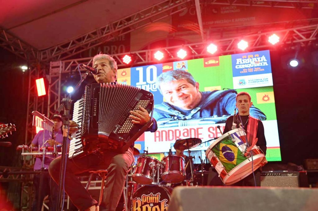 A sanfona de Andrade de Sertânia, forrozeiro experiente que há 40 anos defende o autêntico forró tradicional, abriu o Arraiá da Conquista, com um repertório de músicas de Luiz Gonzaga, Jackson do Pandeiro, Trio Nordestino, entre outros. Segundo Andrade, o Arraiá deste ano será um grande sucesso. “Estou muito feliz em participar pela segunda vez do Arraiá da Conquista, que a cada ano fica melhor. Agradeço à Prefeitura pela realização deste evento e espero que o público gaste a sola do sapato com nosso forró”. Kinsey Ferreira e sua família ficou muito feliz em passar pela praça e ouvir os acordes da sanfona, um sinal de que a melhor festa do ano já começou. “Para mim é melhor época do ano é essa, pelo frio, as pessoas andam bem arrumadas. Todo ano eu passo aqui na praça, gosto muito do que a Prefeitura traz, das comidas saborosas. Hoje, estava passando aqui e como minhas duas filhas gostam muito de música eu parei para elas poderem ouvir a sanfona”, comentou Kinsey.