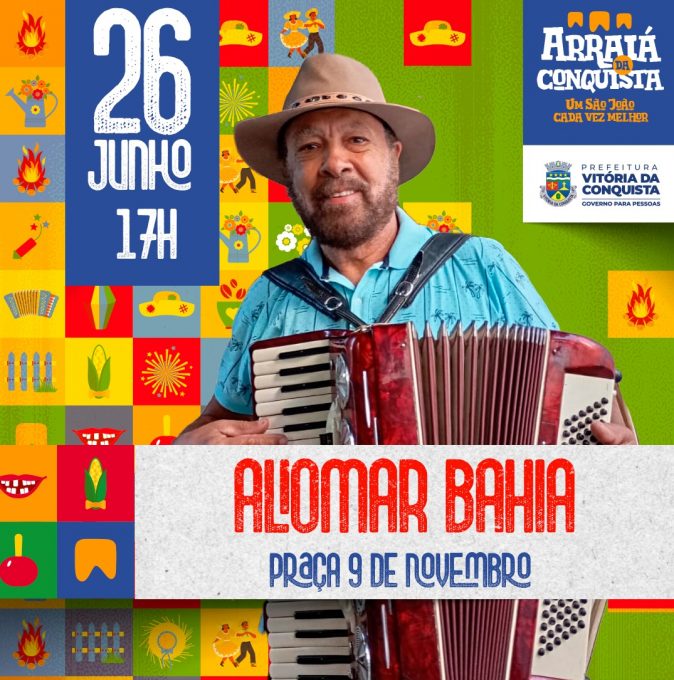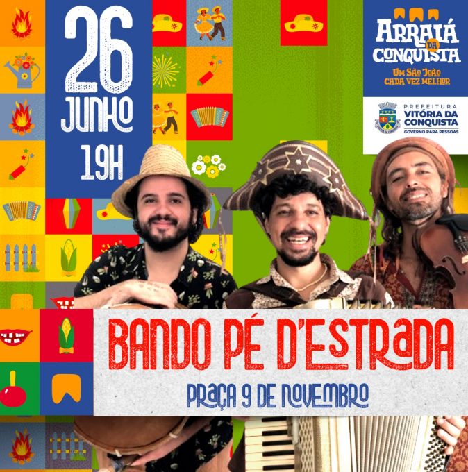 O Arraiá da Conquista segue animando a Praça Nove de Novembro. Nesta quarta-feira (26), se apresentam no Aliomar Bahia, às 17h, e Bando Pé D’Estrada, às 19h. Os shows tiveram início no dia 10 e se estendem até 28 de junho, com a presença de diversas bandas regionais.