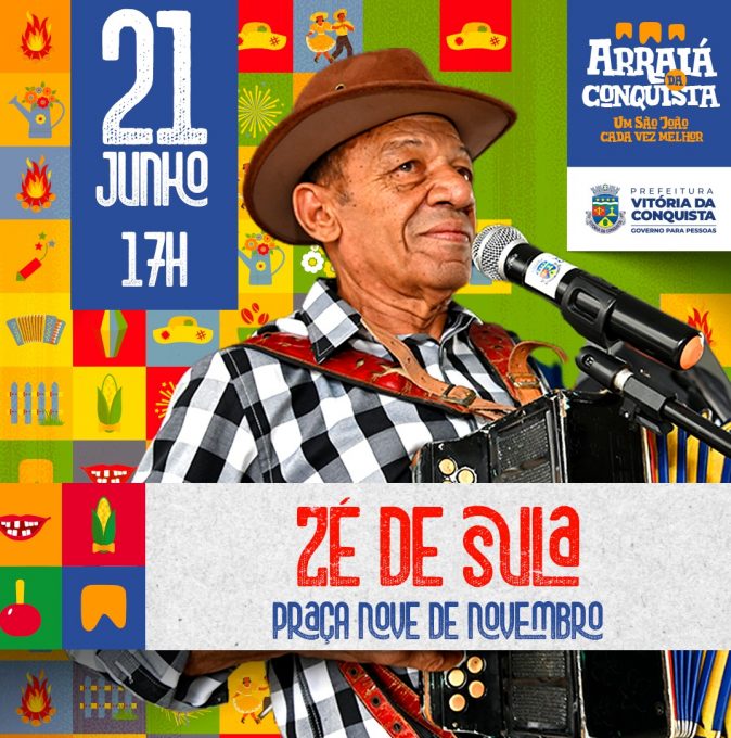 Sanfoneiro conhecido por sua habilidade e paixão pela música, Zé de Sula é uma das atrações do Arraiá da Conquista. Sua apresentação está marcada para às 17h, prometendo animar o público com seu forró das antigas. Não perca essa oportunidade de apreciar a tradicional música de São João ao som da sanfona de Zé de Sula.