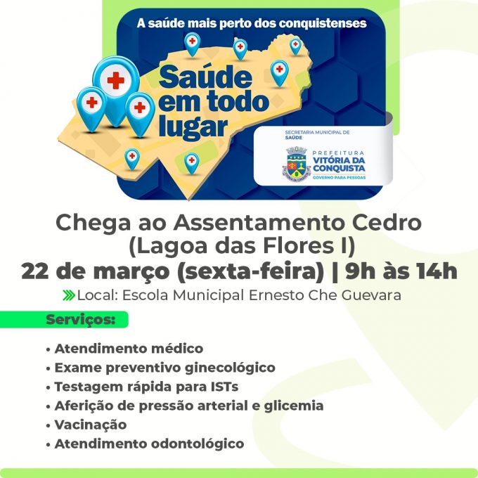 Levando mais oferta de atendimentos de saúde à comunidade, a 25ª edição do projeto Saúde em Todo Lugar será realizada nesta sexta-feira (22), no Assentamento Cedro, localizado na região da Lagoa das Flores I. A ação será das 9h às 14h, na Escola Municipal Ernesto Che Guevara.