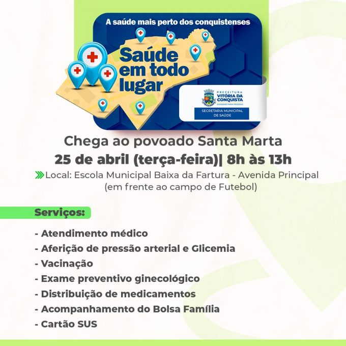 Nesta terça-feira (25), a caravana do projeto Saúde em Todo Lugar, da Secretaria Municipal de Saúde (SMS), estará no assentamento Santa Marta, com atendimentos na área de saúde para a comunidade local. A ação será das 8h às 13h, na Escola Municipal Baixa da Fartura, localizada na Avenida Principal, em frente ao campo de futebol.