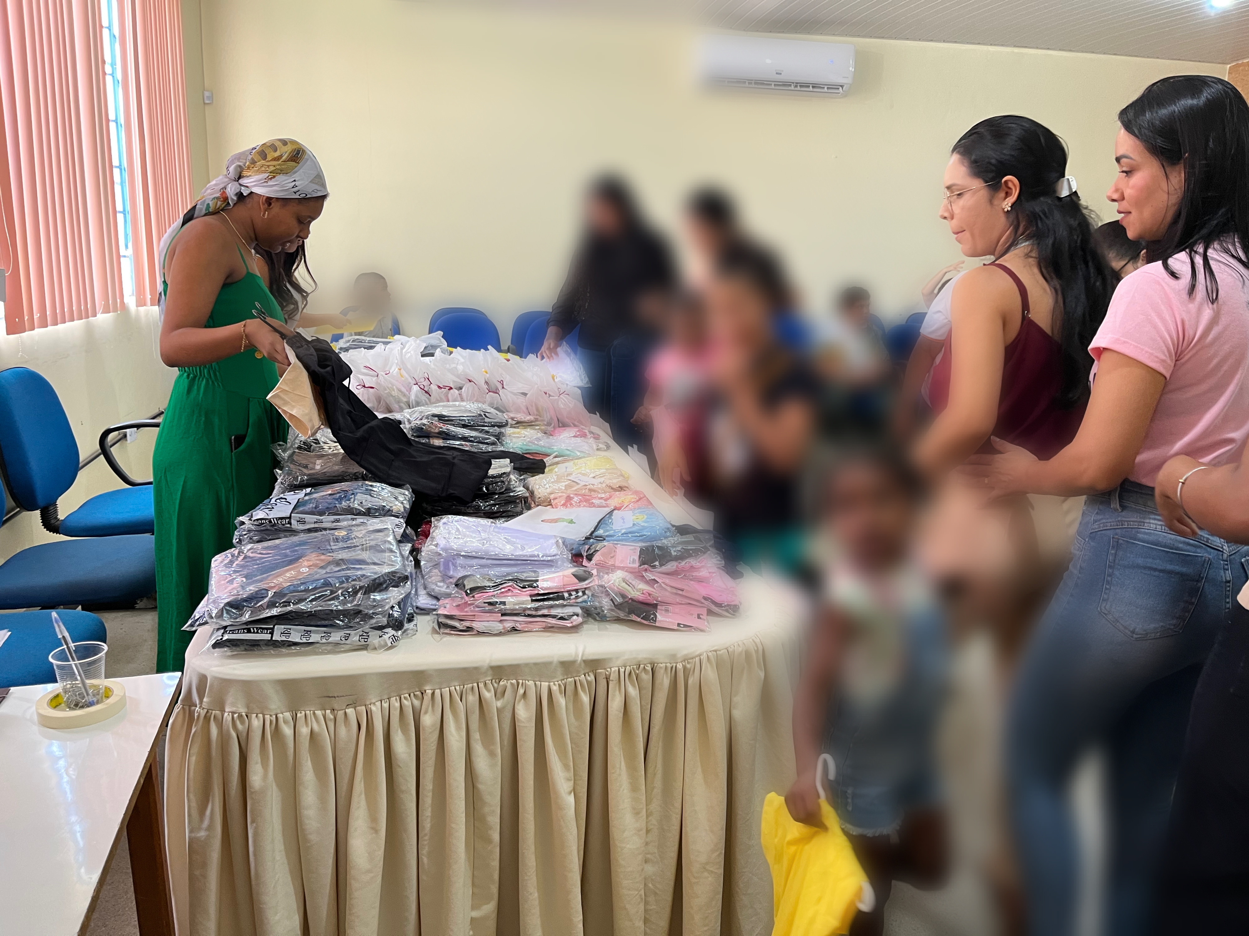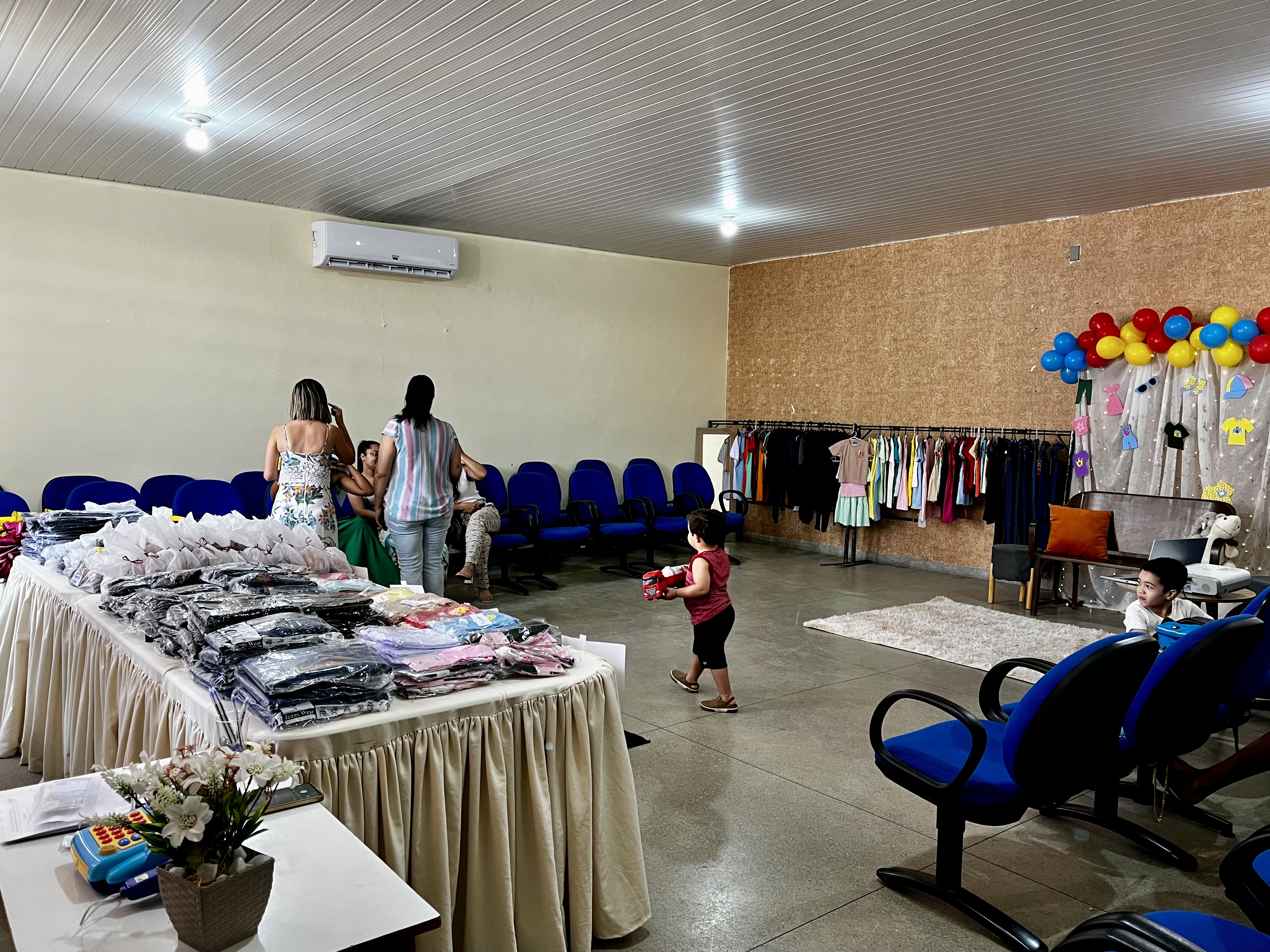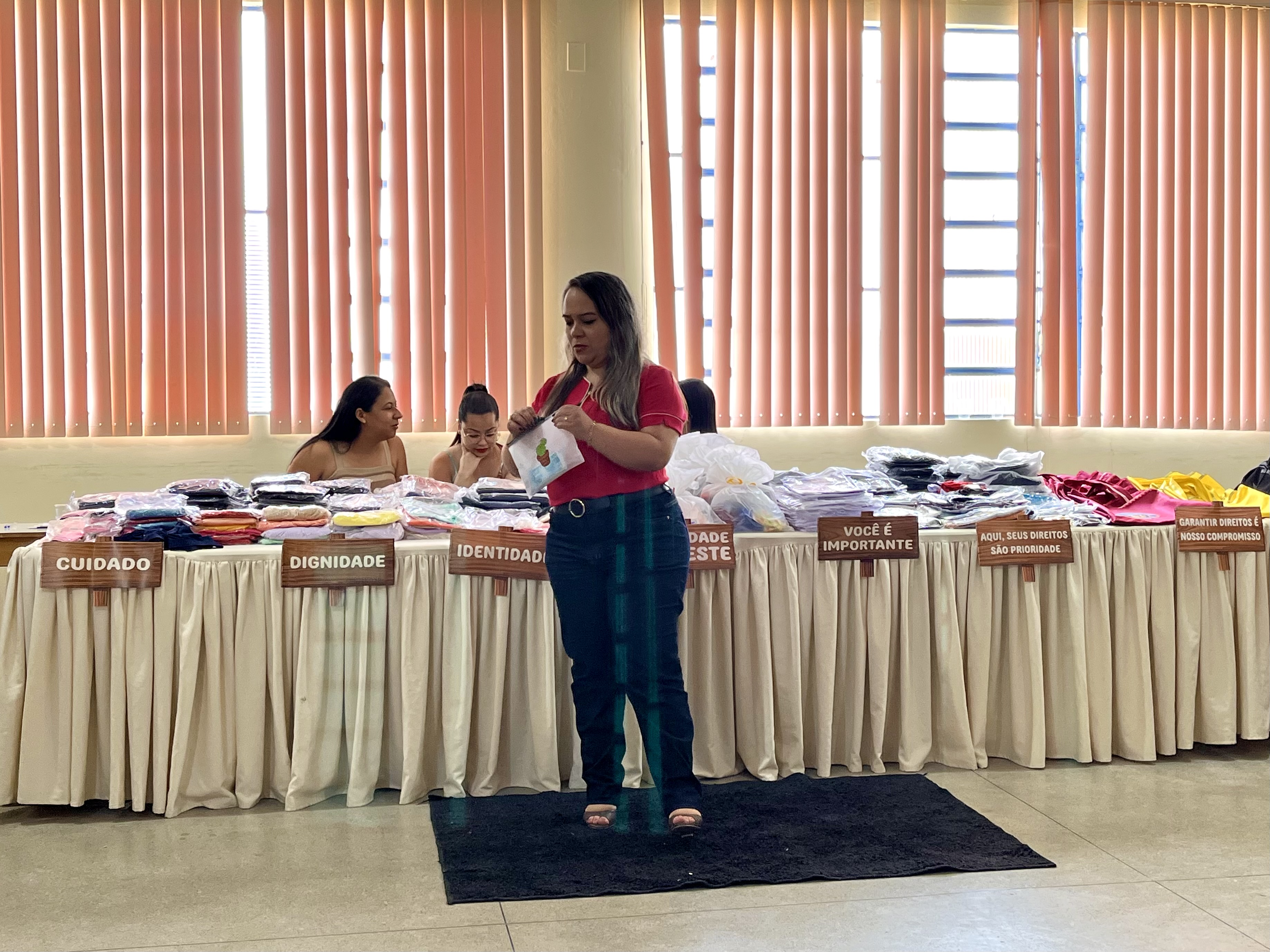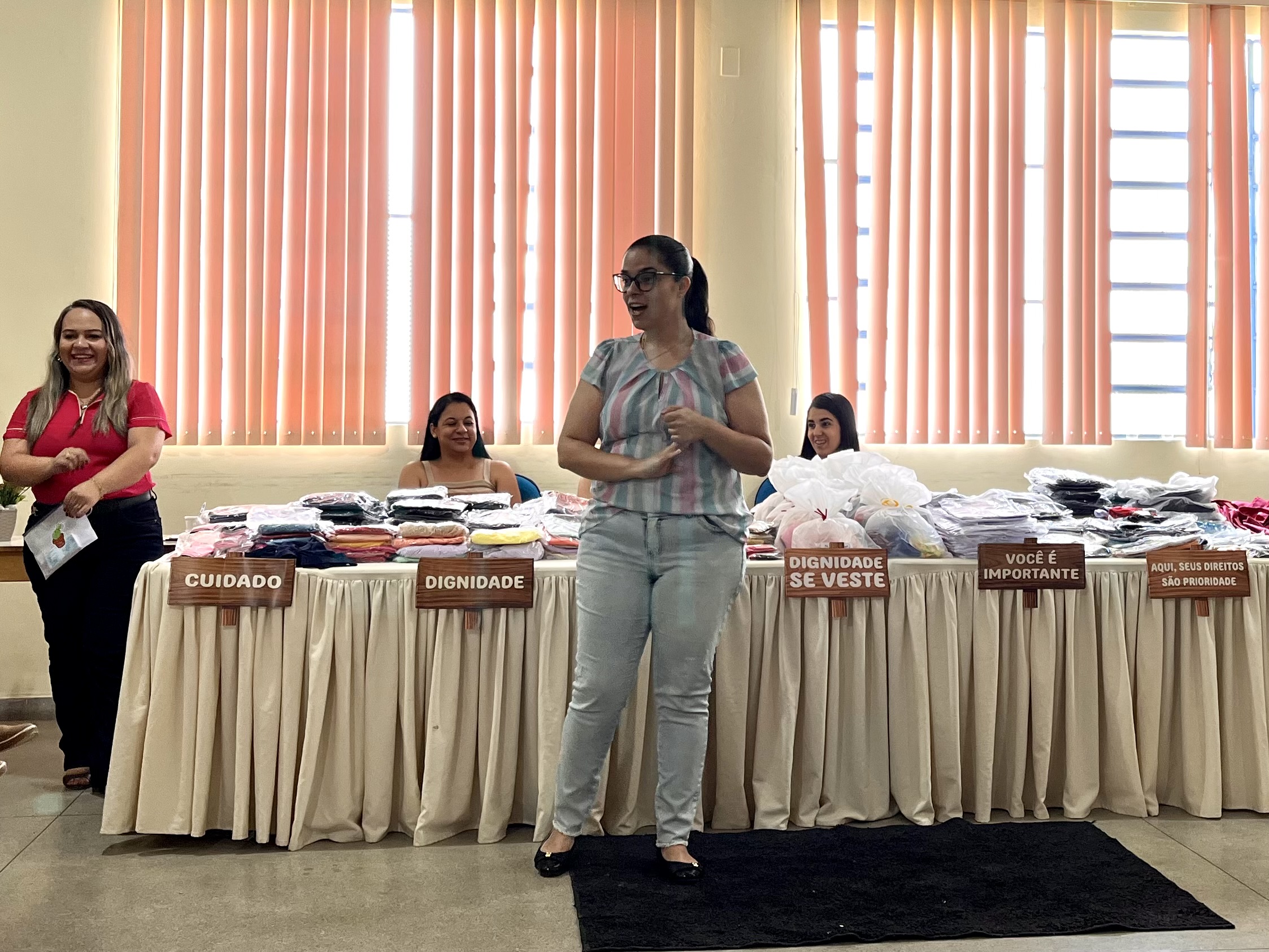 O espaço foi organizado como uma loja, com peças de vestuário dispostas para escolha, balcão de vendas e caixa registradora, com condução dos trabalhadores da Proteção Social Especial (PSE), que atuaram como atendentes, auxiliando nas decisões e no uso do recurso disponível. Cada participante recebeu um valor simbólico para realizar suas compras, sendo orientado a observar critérios como numeração, preferências pessoais e quantidade de itens.