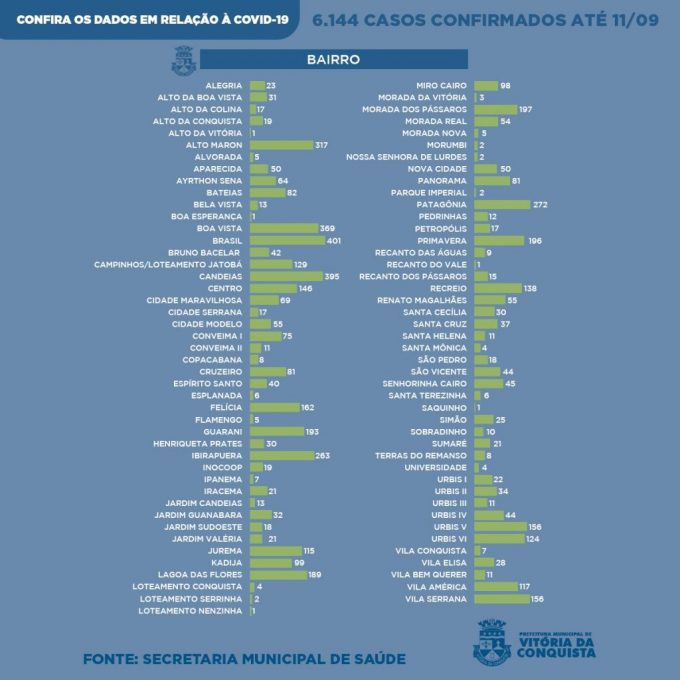 Na zona urbana, foram diagnosticados 5.844 casos da Covid-19 de moradores das seguintes localidades: Alegria (23), Alto da Boa Vista (31), Alto da Colina (17), Alto da Conquista (19), Alto da Vitória (1), Alto Maron (317), Alvorada (5), Aparecida (50), Ayrton Sena (64), Bateias (82), Bela Vista (13), Boa vista (369), Boa Esperança (1), Brasil (401), Bruno Barcelar (42), Campinhos/Loteamento Jatobá (129), Candeias (395), Centro (146), Cidade Maravilhosa (69), Cidade Serrana (17), Cidade Modelo (55), Conveima I (75), Conveima II (11), Copacabana (8), Cruzeiro (81), Espírito Santo (40), Esplanada (6), Felícia (162), Flamengo (5), Guarani (193), Henriqueta Prates (30), Ibirapuera (263), Ipanema (7), Iracema (21), Inocoop (19), Jardim Candeias (13), Jardim Guanabara (32), Jardim Sudoeste (18), Jardim Valéria (21), Jurema (115), Kadija (99), Lagoa das Flores (189), Loteamento Conquista (4), Loteamento Serrinha (2), Loteamento Nenzinha (1), Miro Cairo (98), Morada da Vitória (3), Morada dos Pássaros (197), Morada Real (54), Morada Nova (5), Morumbi (2), Nossa Senhora de Lurdes (2), Nova Cidade (50), Panorama (81), Parque Imperial (2), Patagônia (272), Pedrinhas (12), Petrópolis (17), Primavera (196), Recanto do Vale (1), Recanto das Águas (9), Recanto dos Pássaros (15), Recreio (138), Renato Magalhães (55), Santa Cecília (30), Santa Cruz (37), Santa Mônica (4), Santa Terezinha (6), São Pedro (18), São Vicente (44), Senhorinha Cairo (45), Saquinho (1), Simão (25), Sobradinho (10), Sumaré (21), Santa Helena (11), Terras do Remanso (8), Universidade (4), Urbis I (22), Urbis II (34), Urbis III (11), Urbis IV (44), Urbis V (156), Urbis VI (124), Vila da Conquista (7), Vila Elisa (28), Vila Bem Querer (11), Vila América (117) e Vila Serrana (156).